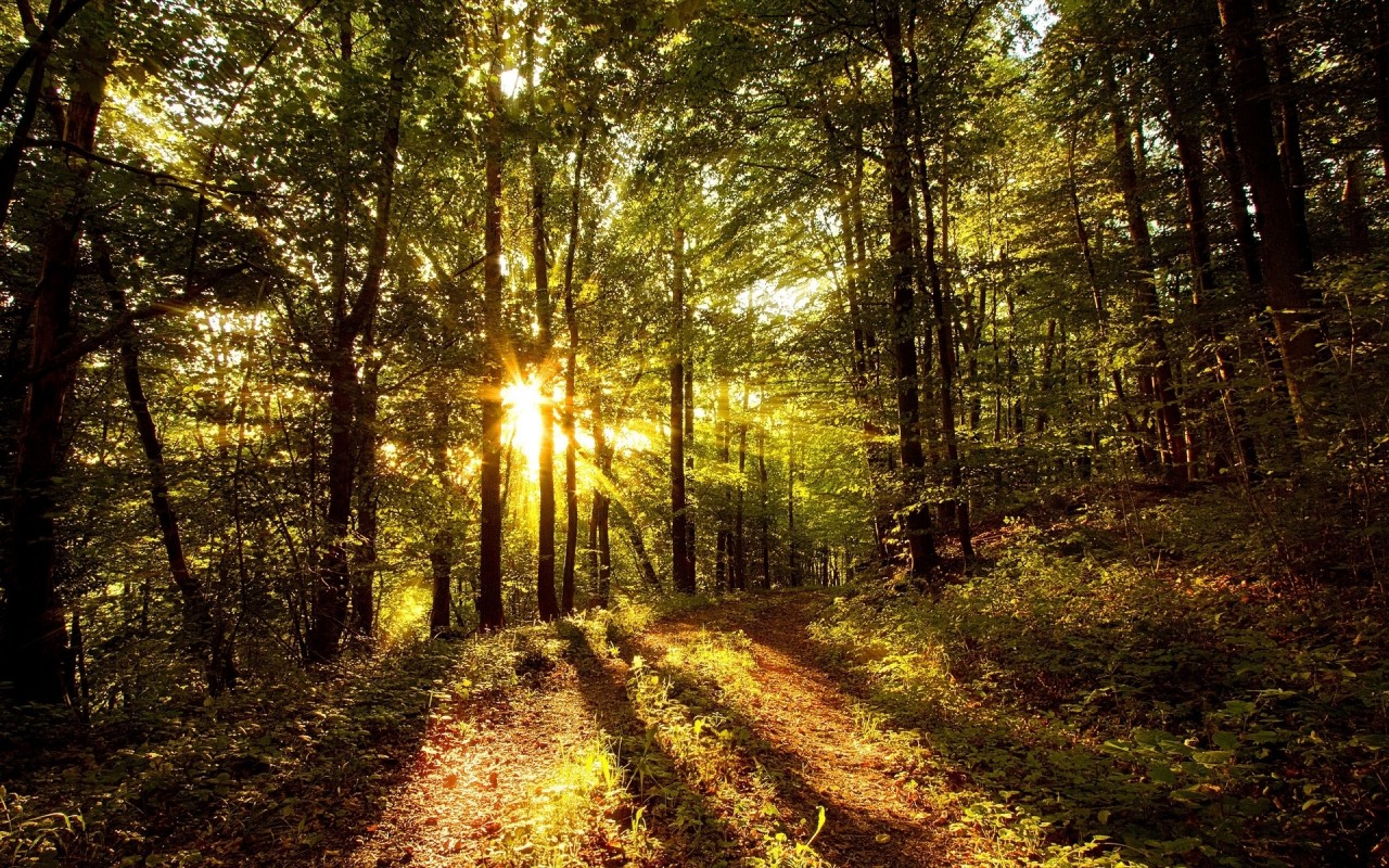 Description: A dirt road in the middle of a forest with the sun shining through the trees and leaves on the ground.