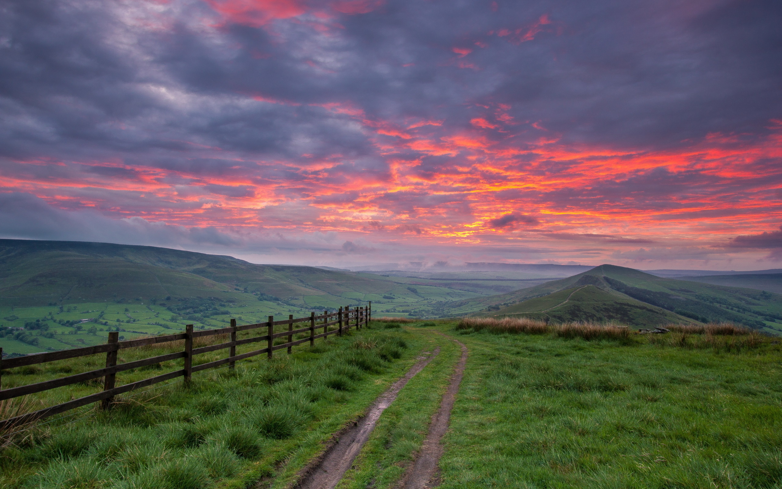 Description: A dirt road going through a lush green field under a cloudy sky with a sunset behind it and a wooden fence.