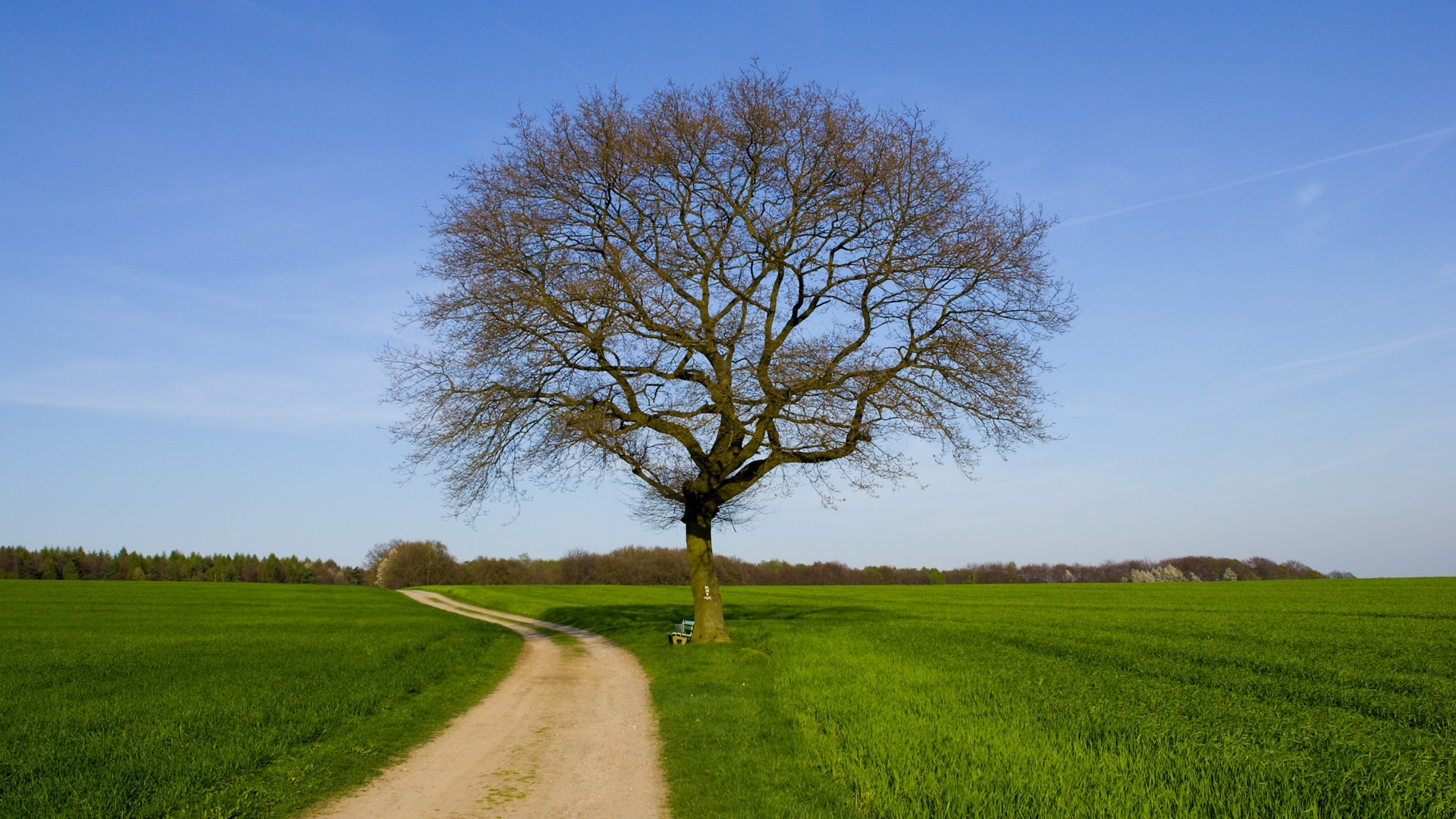 Description: A dirt road going through a green field with a tree in the middle of it and a dirt road leading to the right.