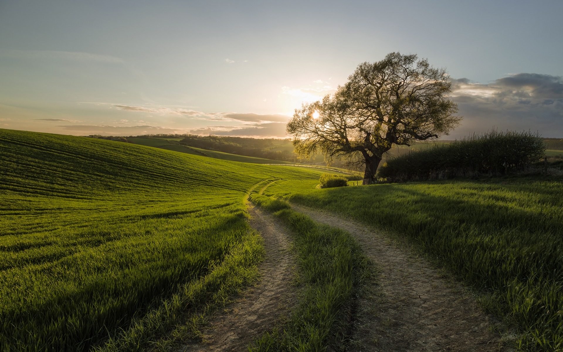 Description: A dirt road going through a green field with a tree in the distance at sunset or dawn or dawn.
