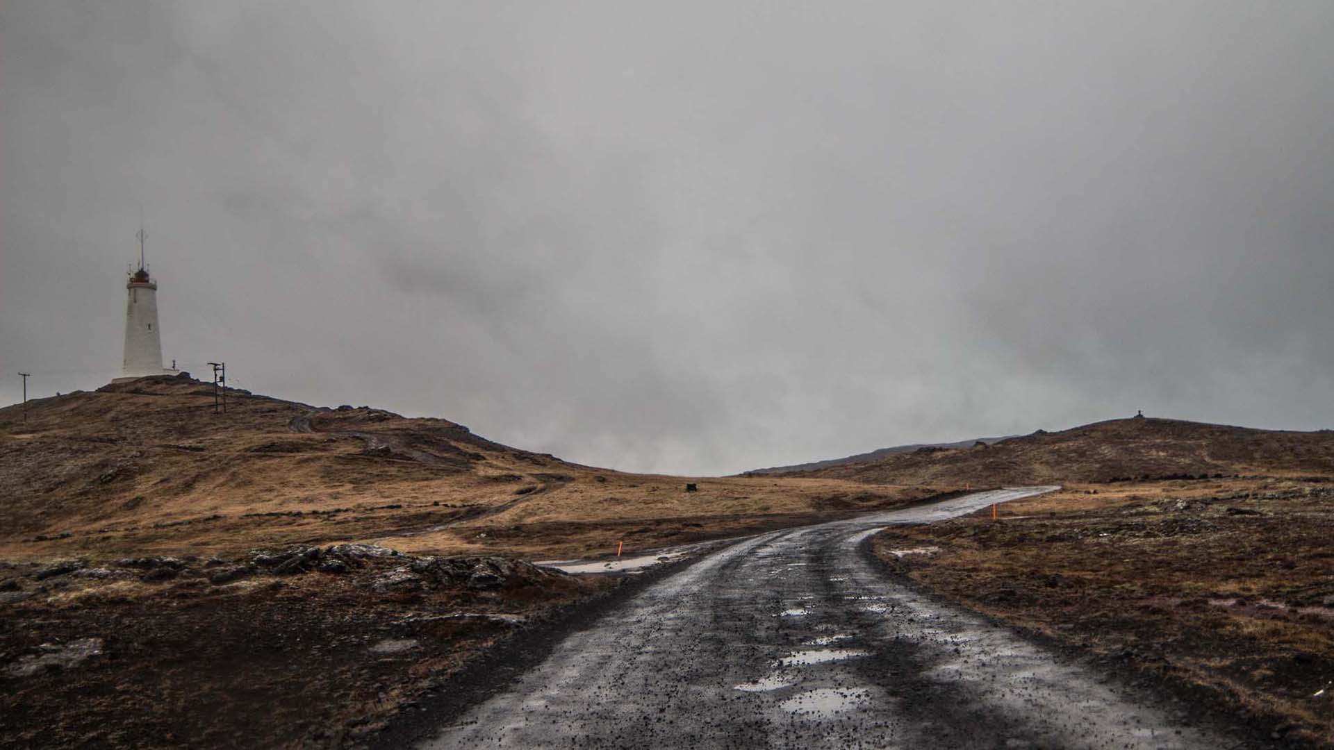 Description: A dirt road with a light house on top of it in the distance on a cloudy day with a gray sky.
