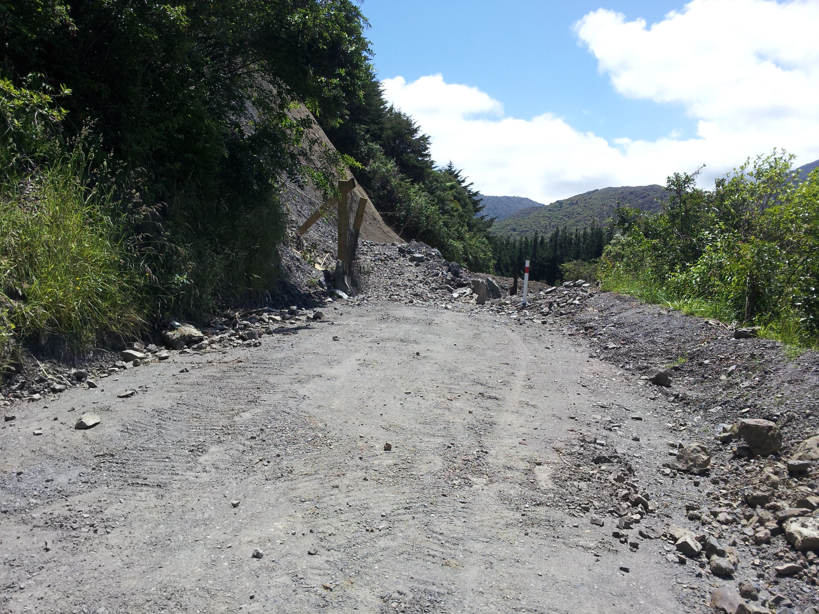 Description: A dirt road with a sign on the side of it and trees on the side of the road and a mountain in the background.