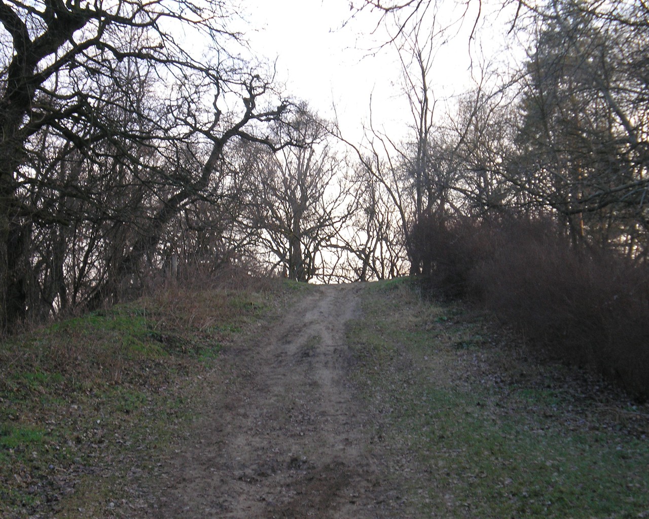 Description: A dirt road with trees and grass on both sides of it and a dirt road leading to the right.