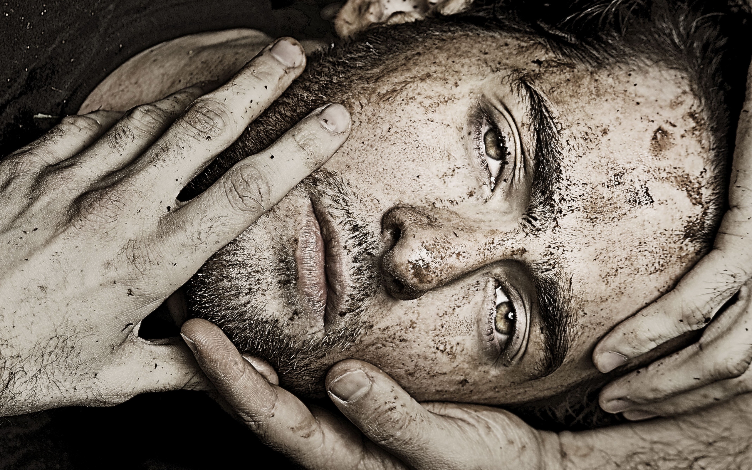 Description: A man with dirty hands covering his face and eyes.