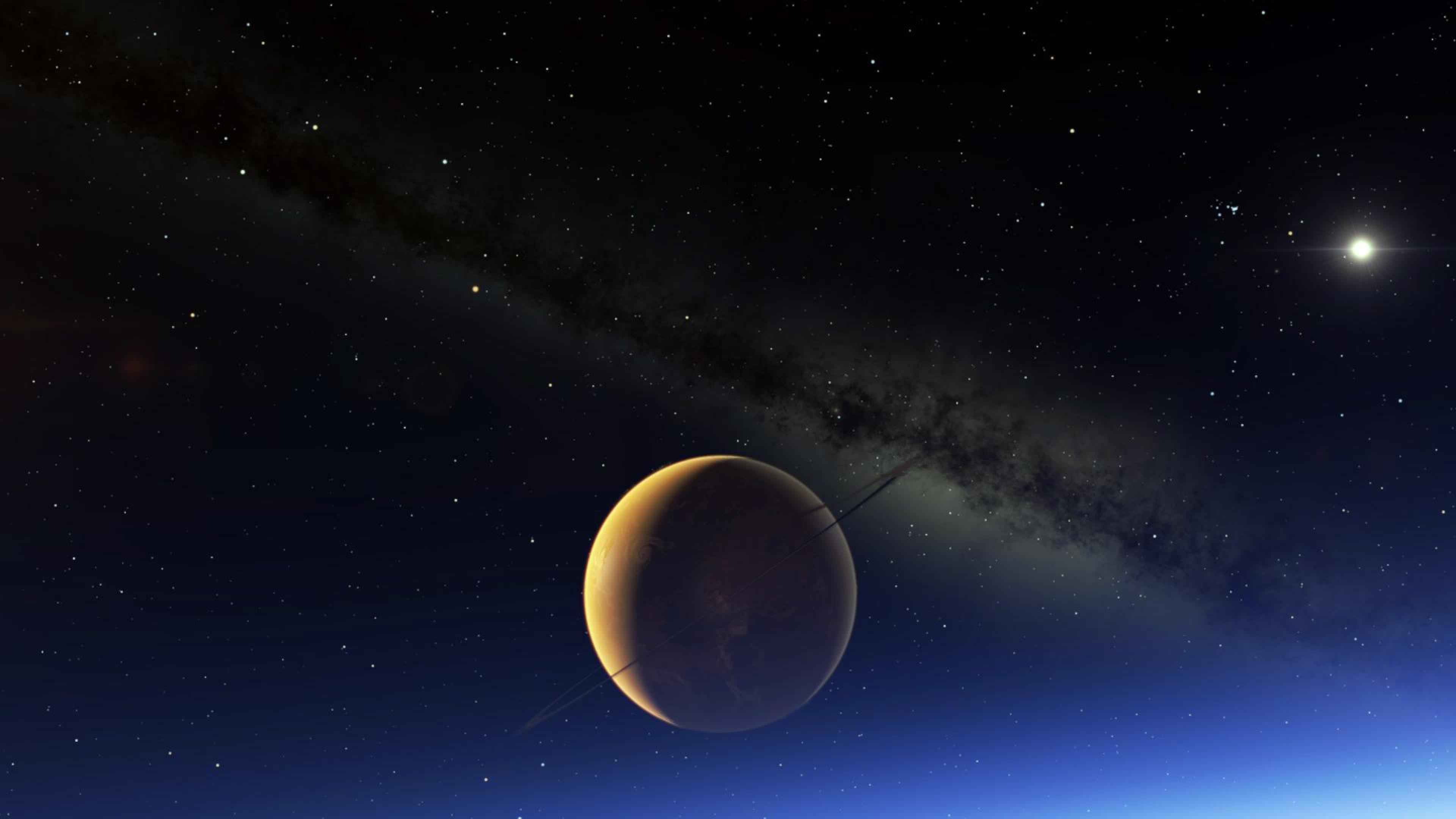 Description: A distant object in the sky with a star in the background and a distant object in the foreground.