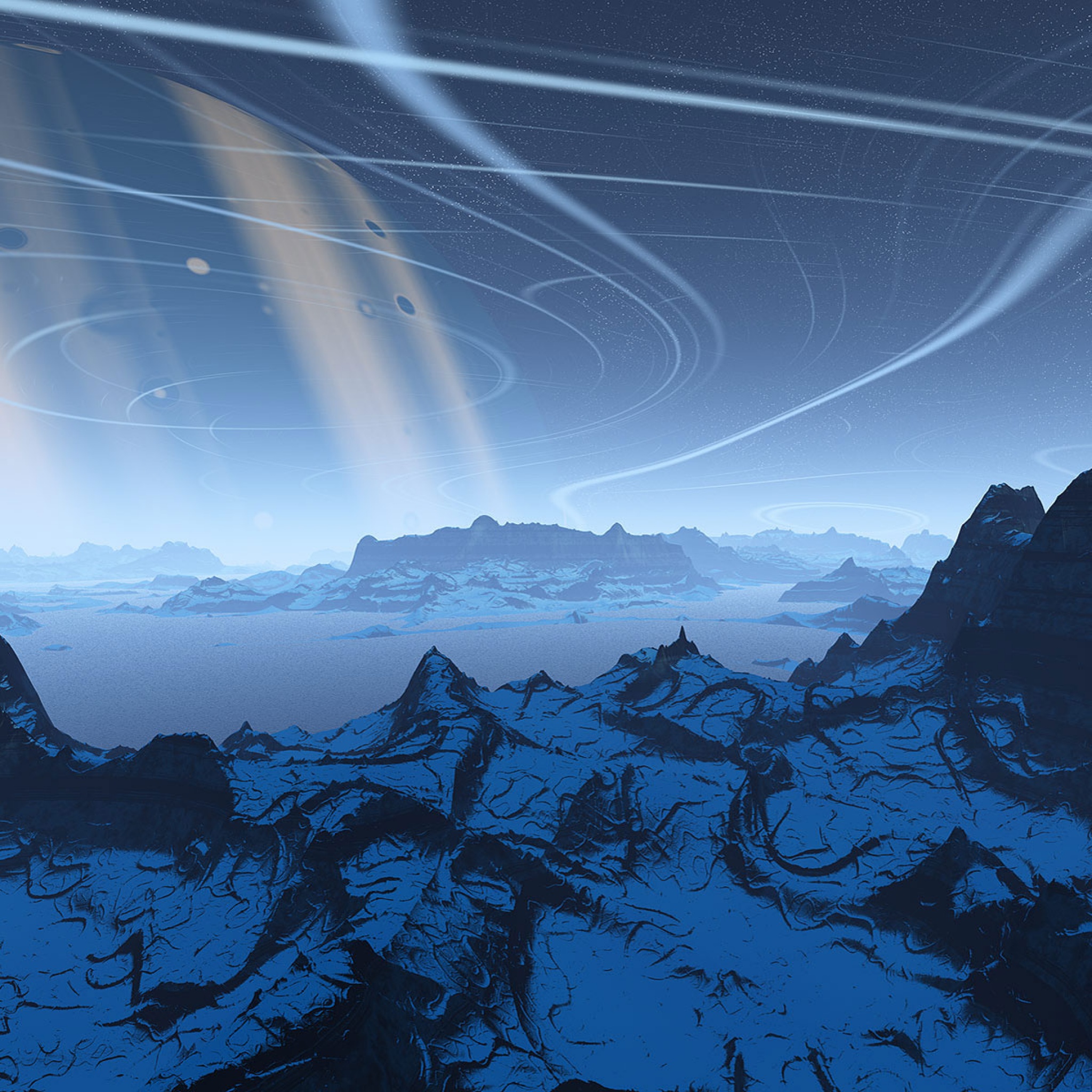 Description: A view of a distant planet with a ring of stars in the sky and mountains in the foreground.