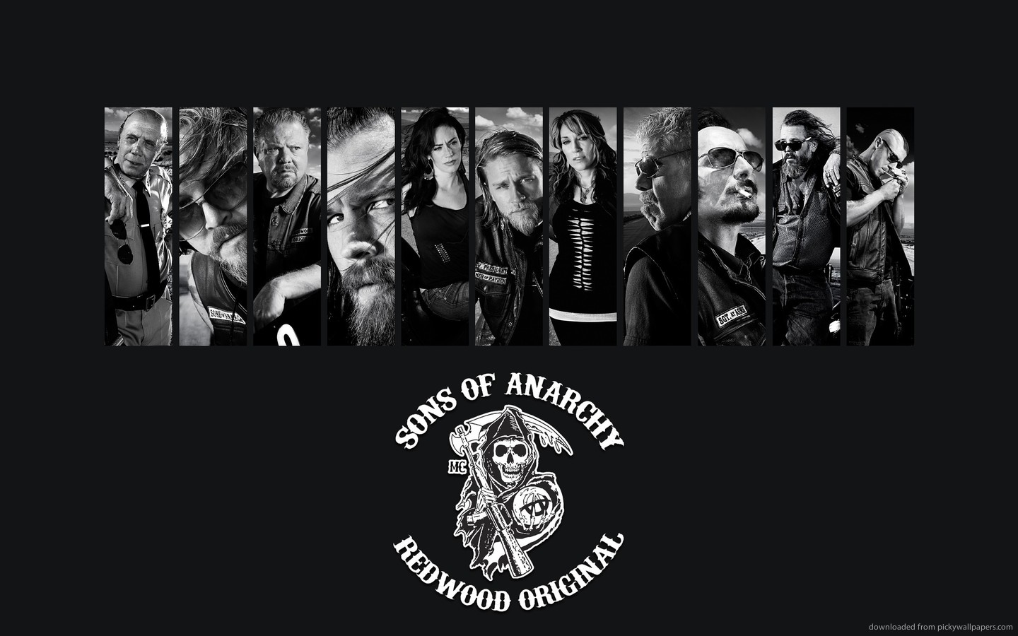 Description: A group of people with different types of hair and beards and a skull on the side of the picture.