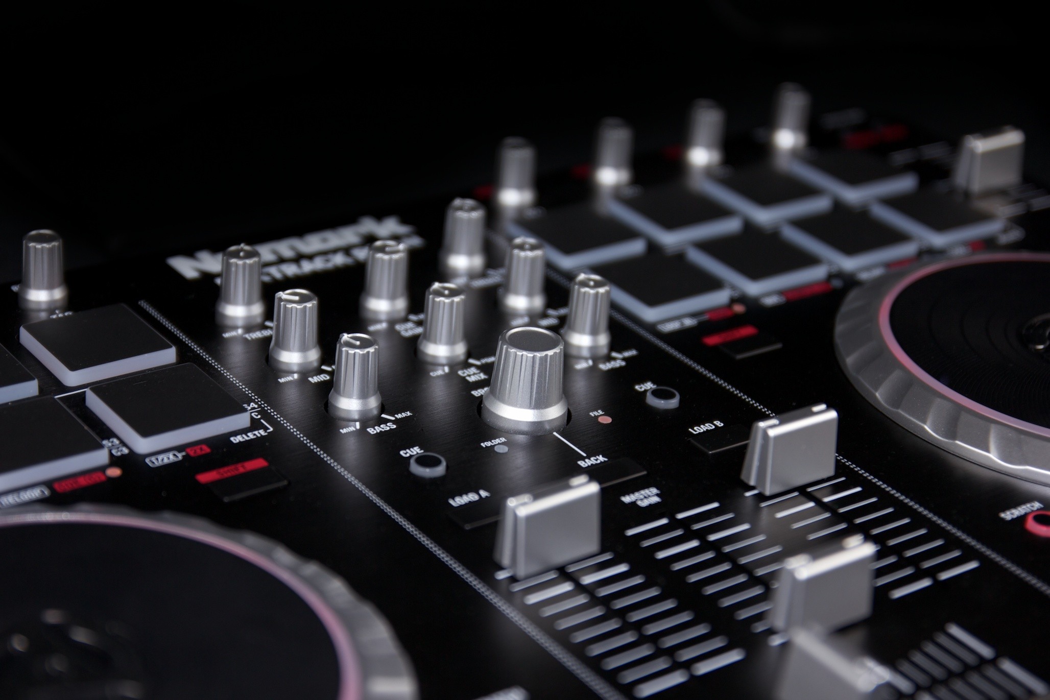 Description: A dj mixing equipment with a black background and red accents on it's sides and a black background.