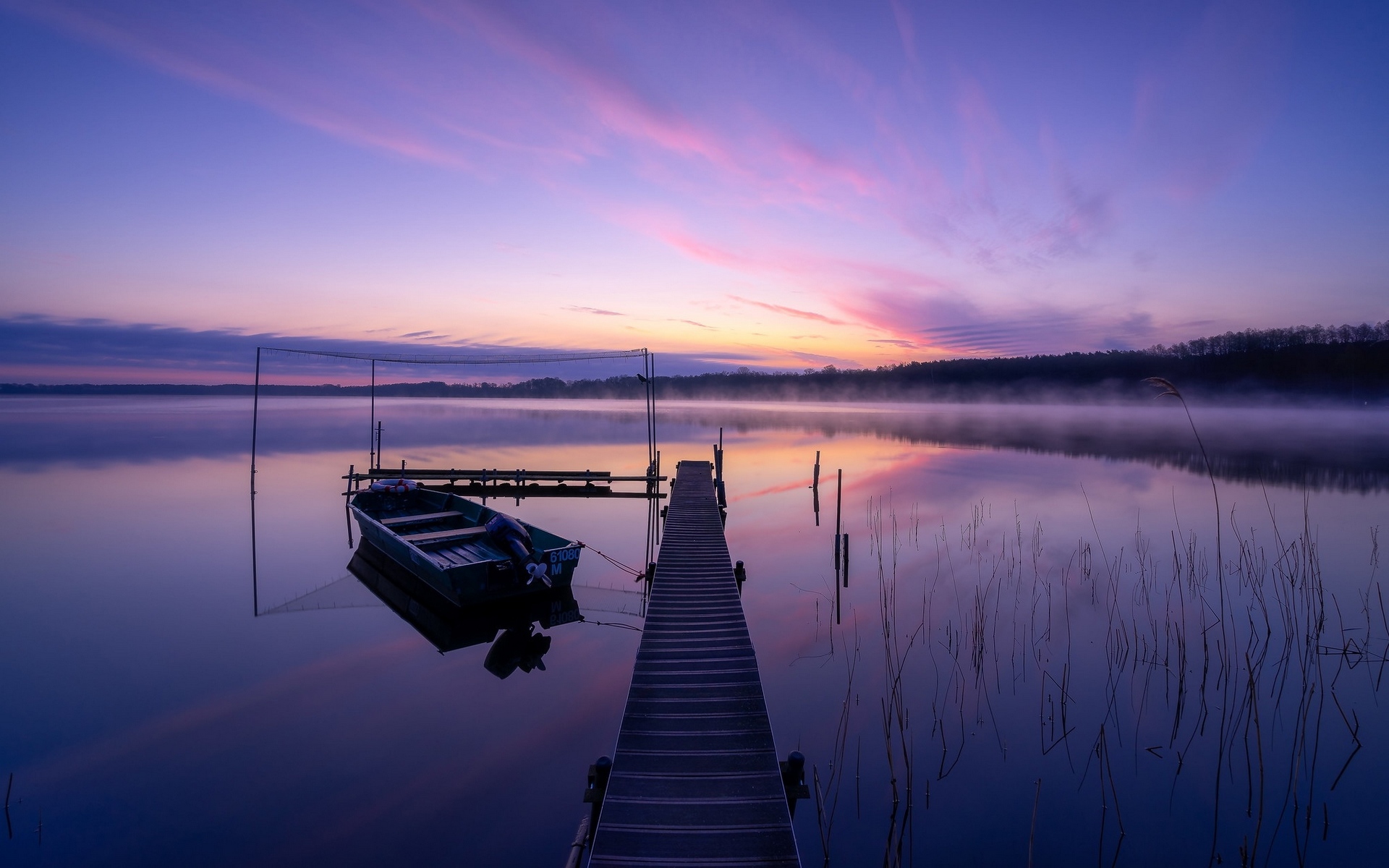 Description: A dock with a boat on it at sunset or dawn with a fog in the air and a few clouds.