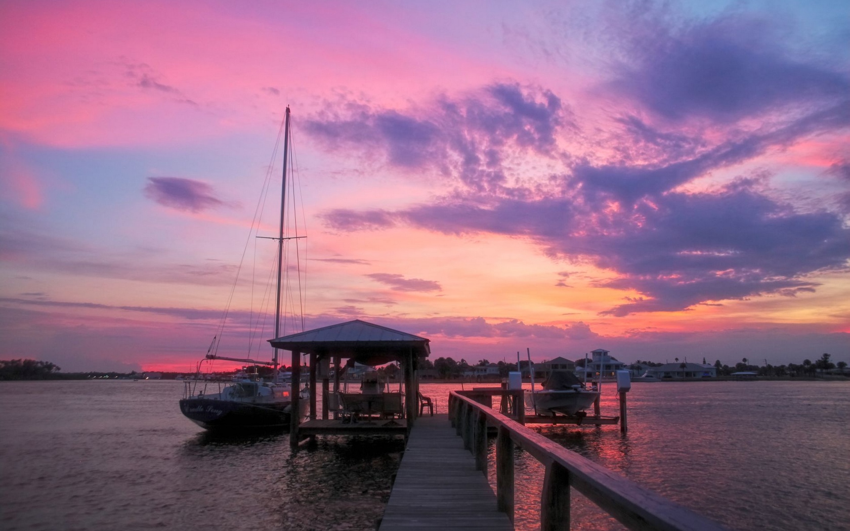 Description: A dock with a boat and a pier with a gazebo at sunset or dawn with clouds in the sky.