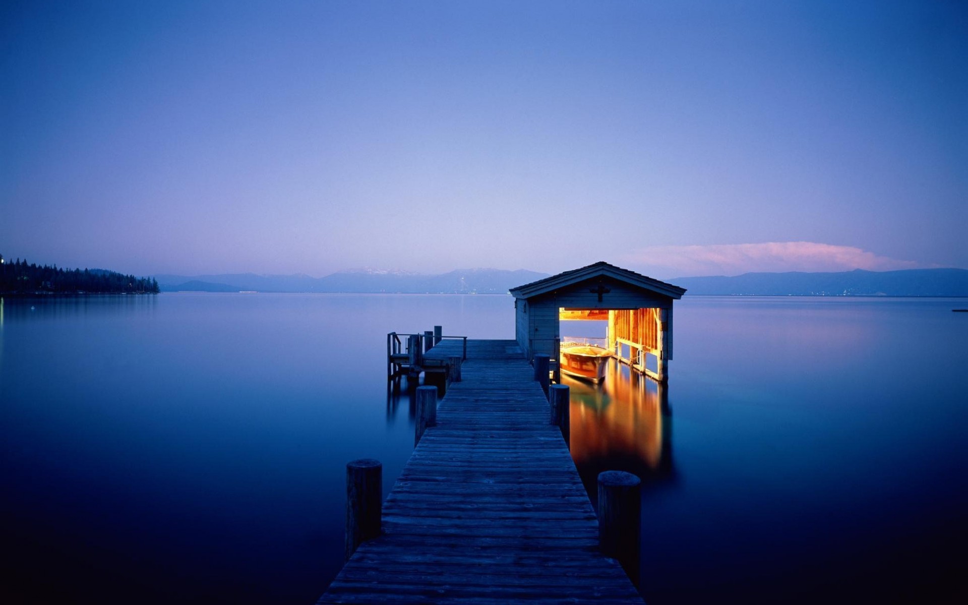 Description: A dock with a boathouse on it at night time with a boat in the water and a dock in the foreground.