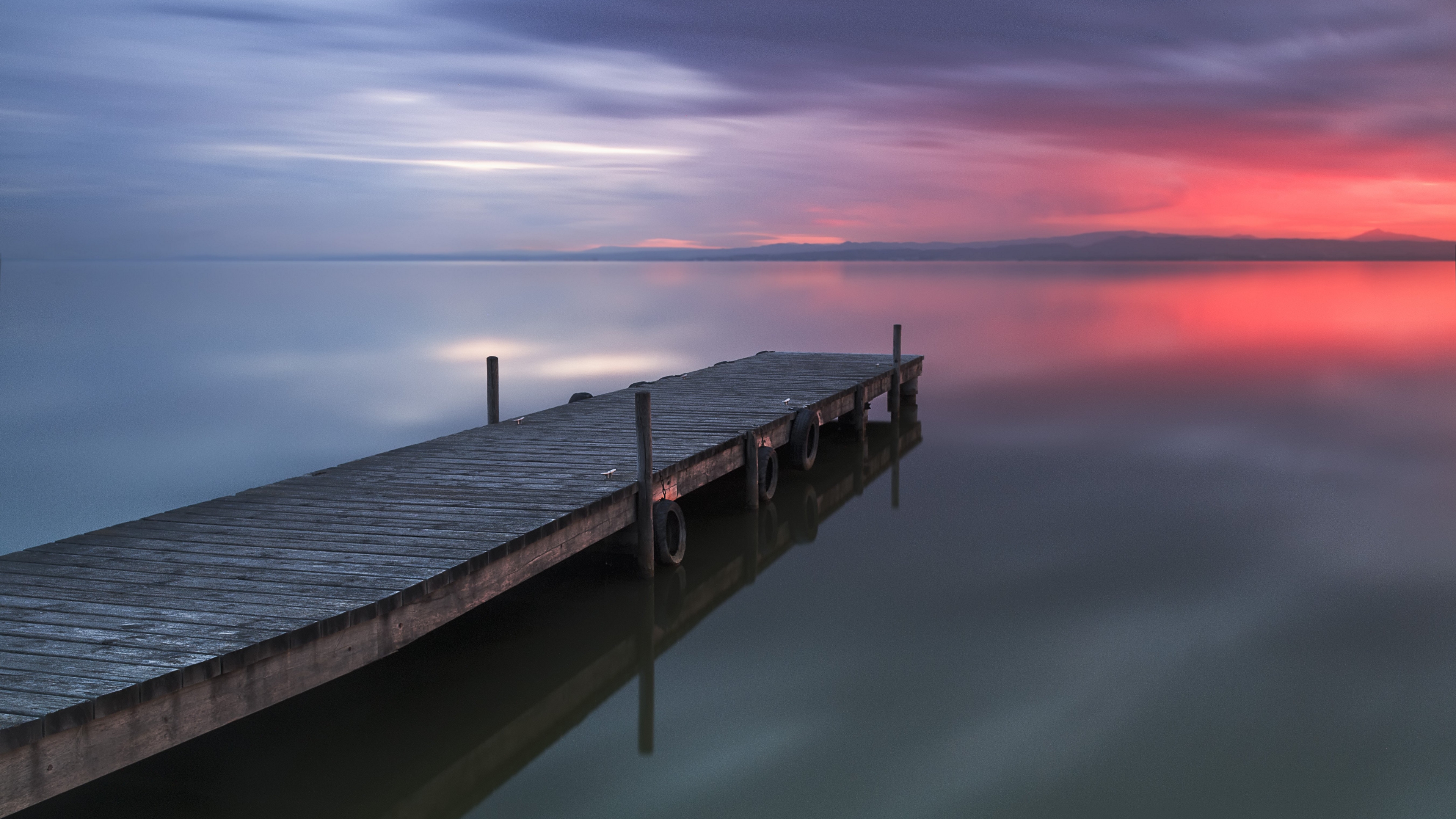 Description: A dock with a long wooden pier sitting on top of it under a cloudy sky with a red and blue sky.