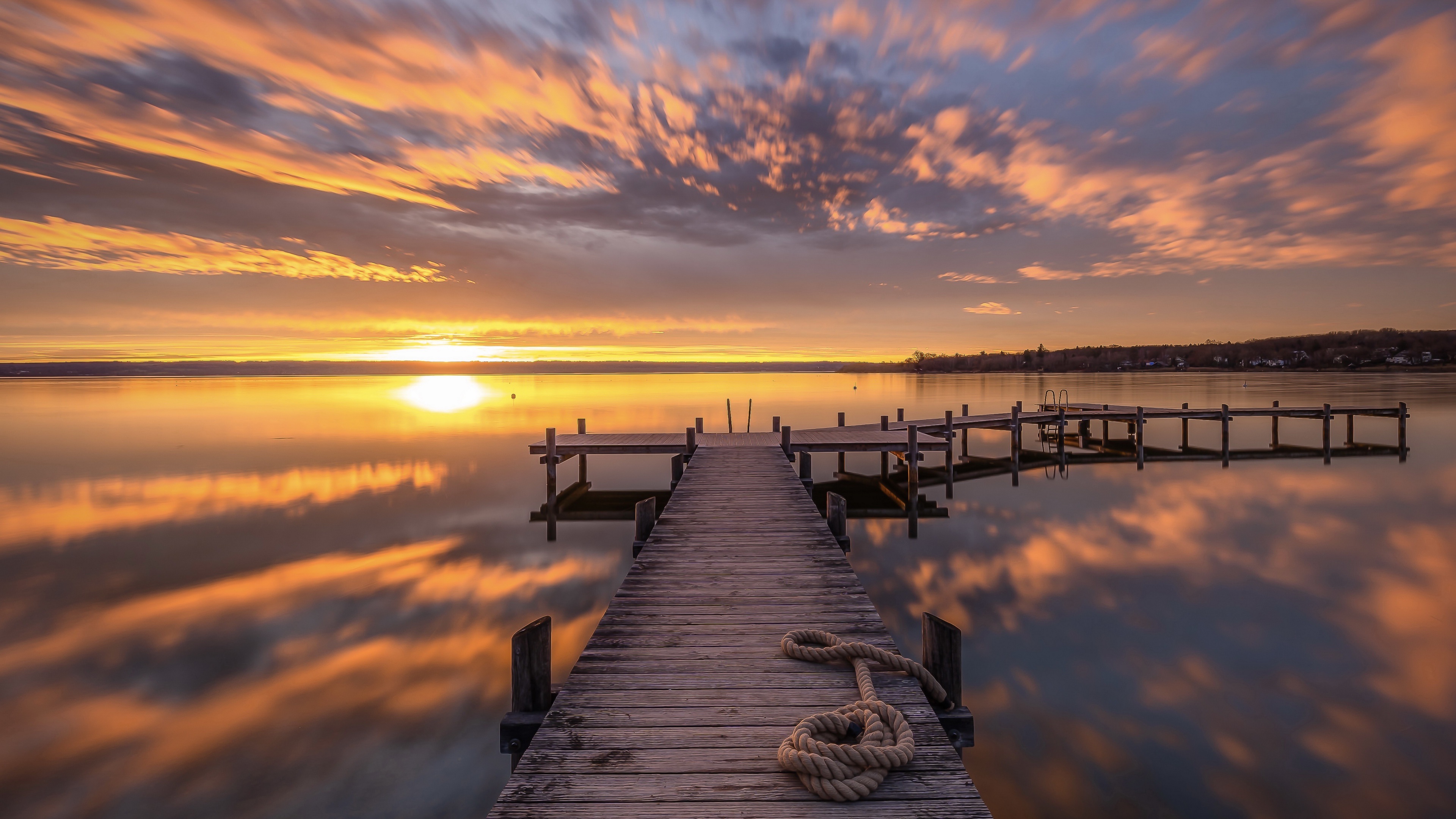 Description: A dock with a rope on it and a sunset in the background with clouds in the sky and a boat in the water.