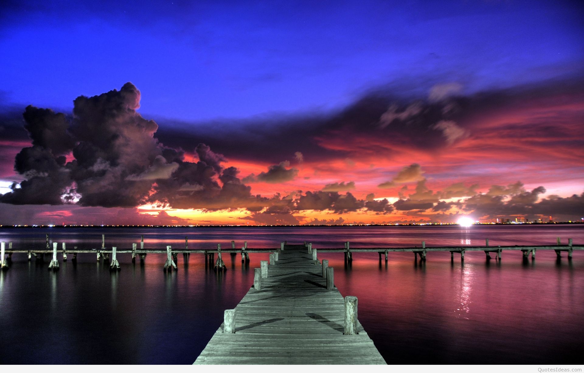 Description: A dock with a sunset in the background and clouds in the sky above it and a body of water.