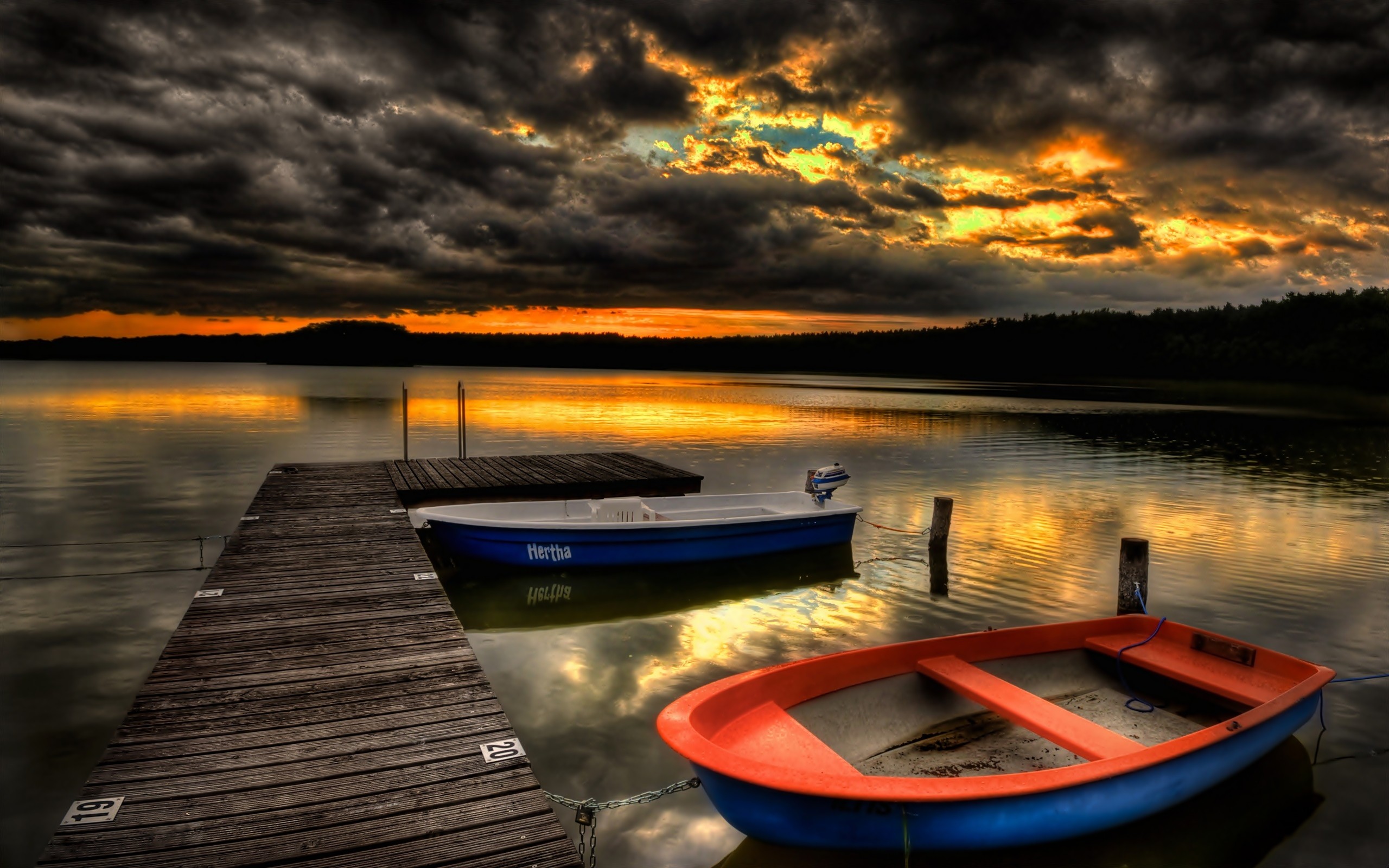 Description: A boat is docked at a dock on a lake at sunset or dawn with a dramatic sky in the background.