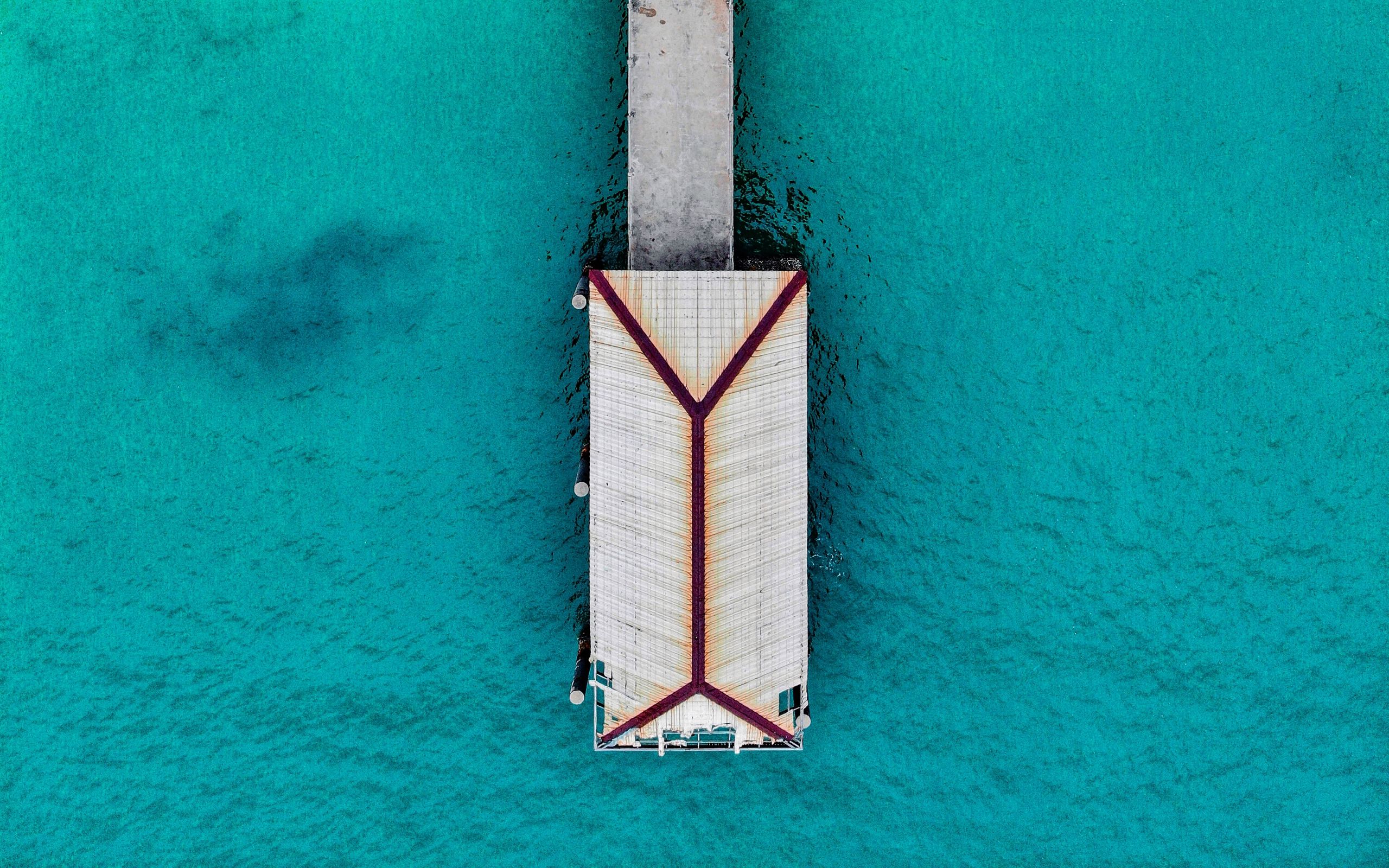 Description: A boat is docked in the water near a pier and a pier structure that is connected to a pier.
