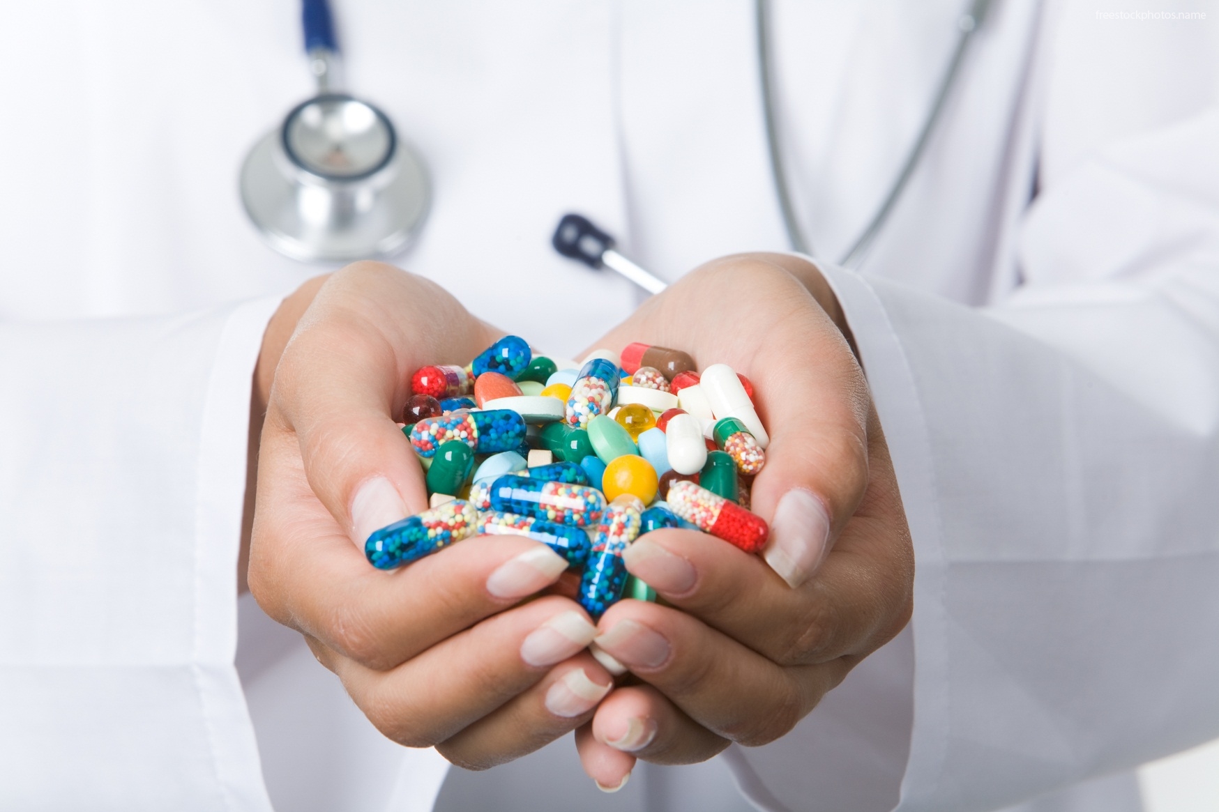 Description: A doctor holding a handful of pills in her hands with a stethoscope in the background on a white background.