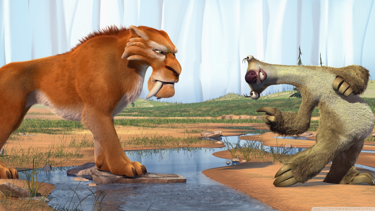 Description: A couple of animals that are standing in the dirt near water and grass.