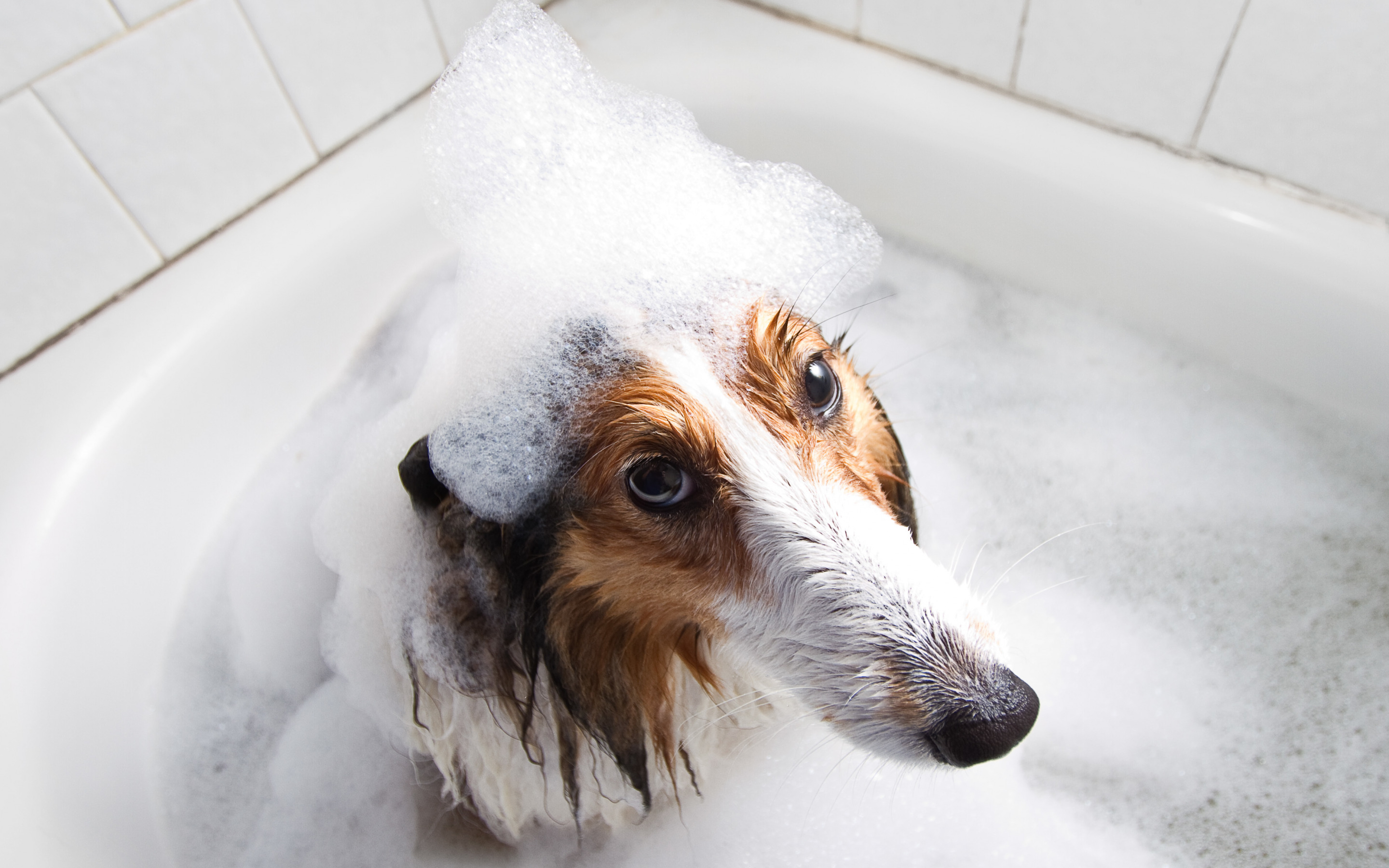 Description: A dog is sitting in a bathtub with foam on it's head and it's head sticking out of the water.