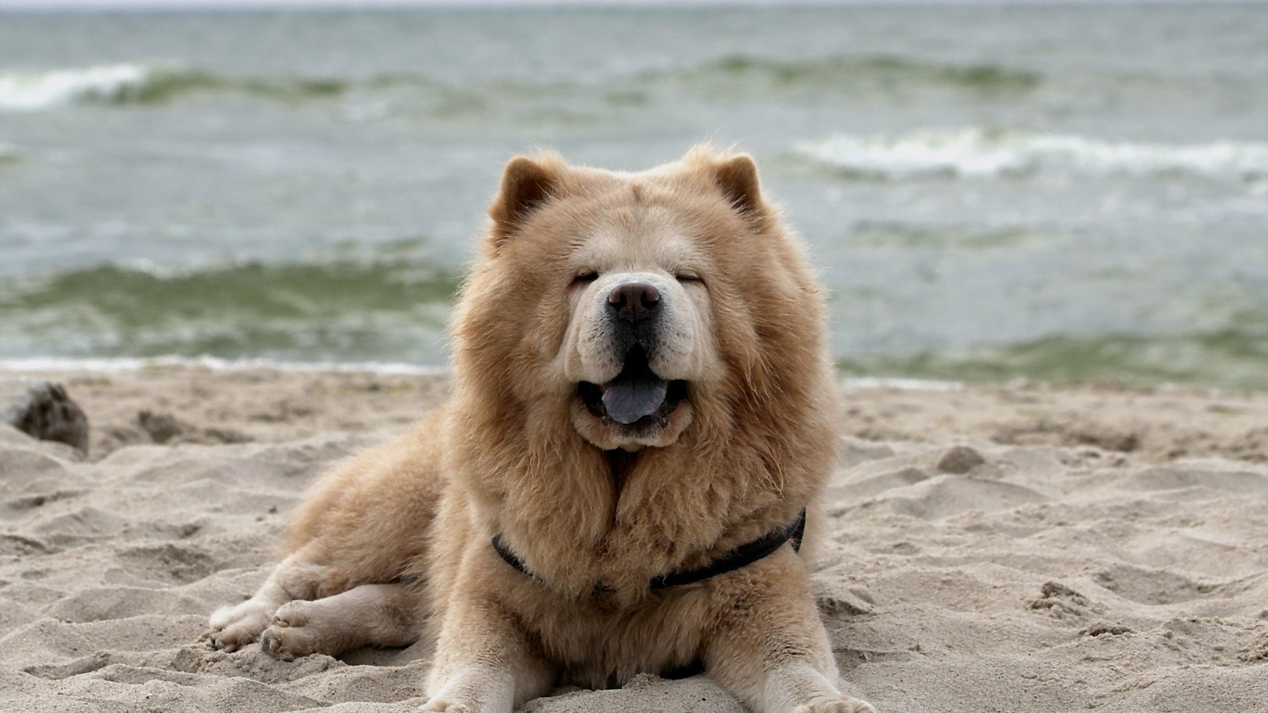 Description: A dog is sitting on the beach with his tongue out and his eyes open and his tongue out is sticking out.