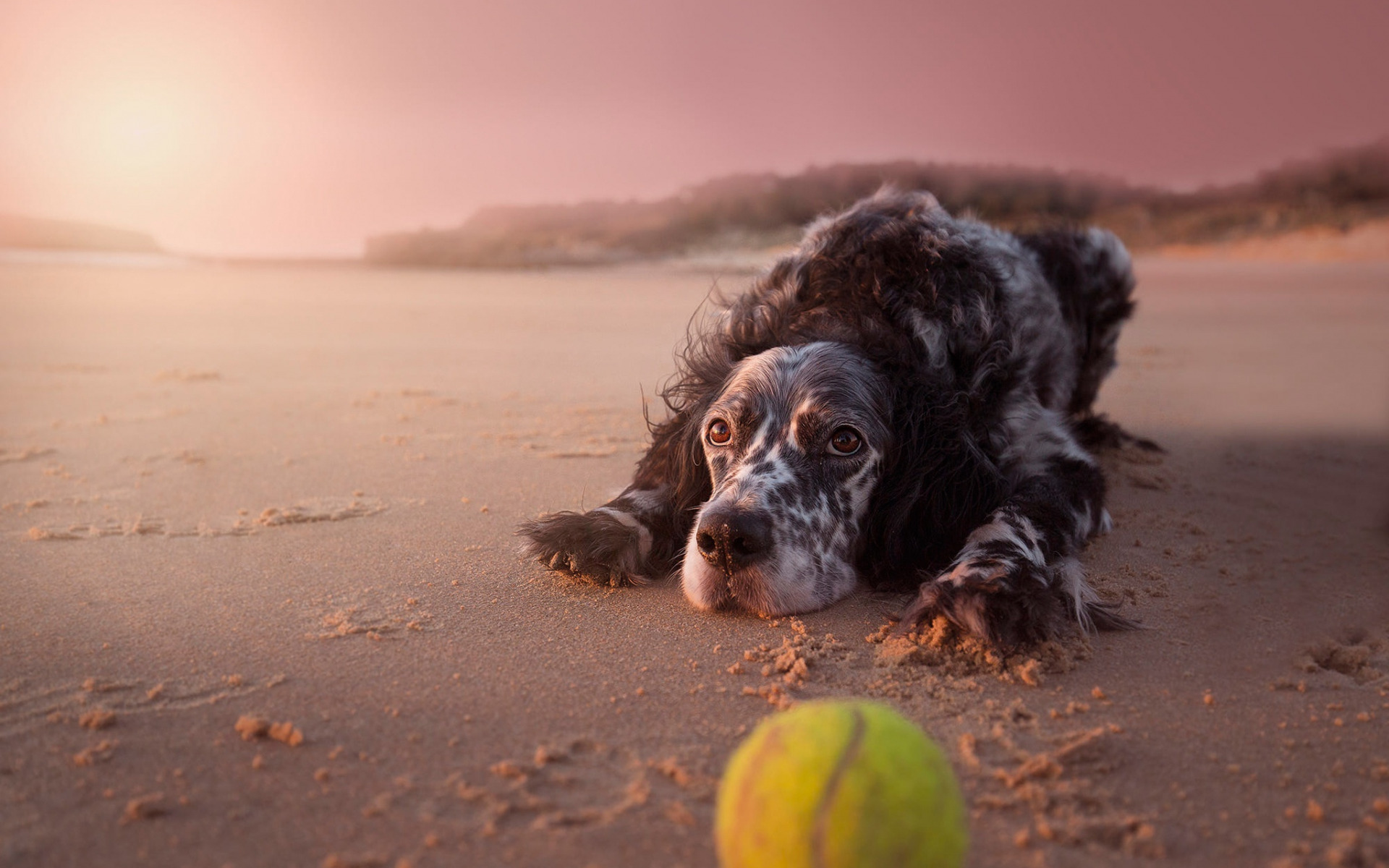 Description: A dog laying on the beach with a tennis ball in front of him and a pink sky in the background.