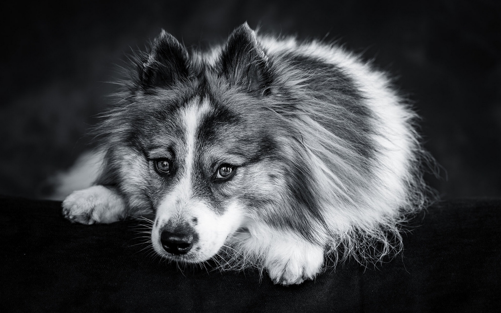 Description: A dog laying down on a black surface with a black background and a black background behind it.