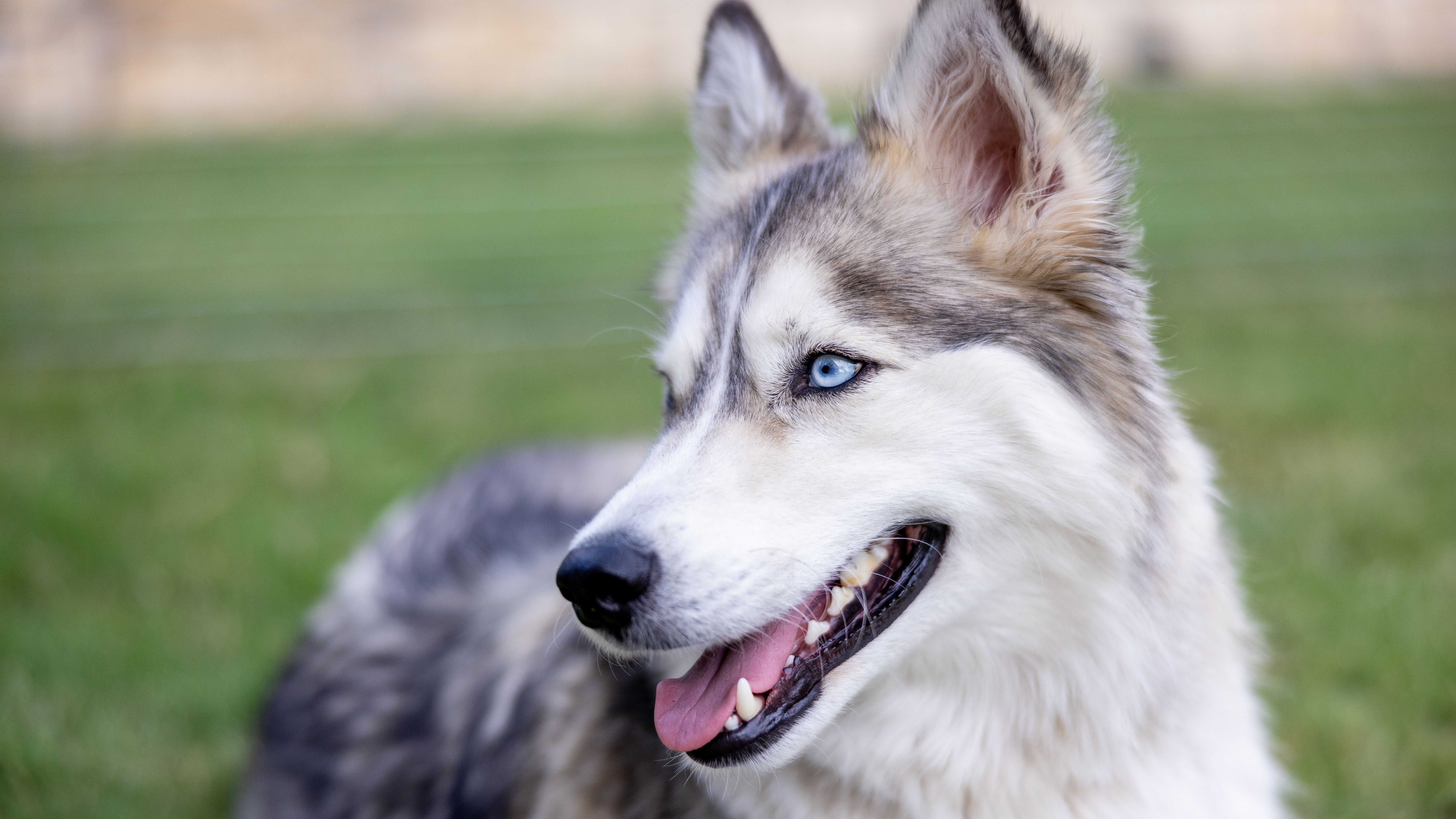 Description: A dog with blue eyes is standing in the grass and looking at the camera with a smile on his face.