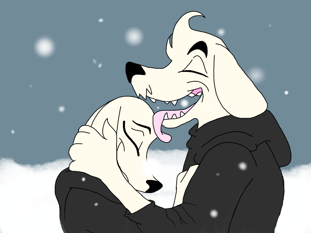Description: A dog and a cat are hugging in the snow together.