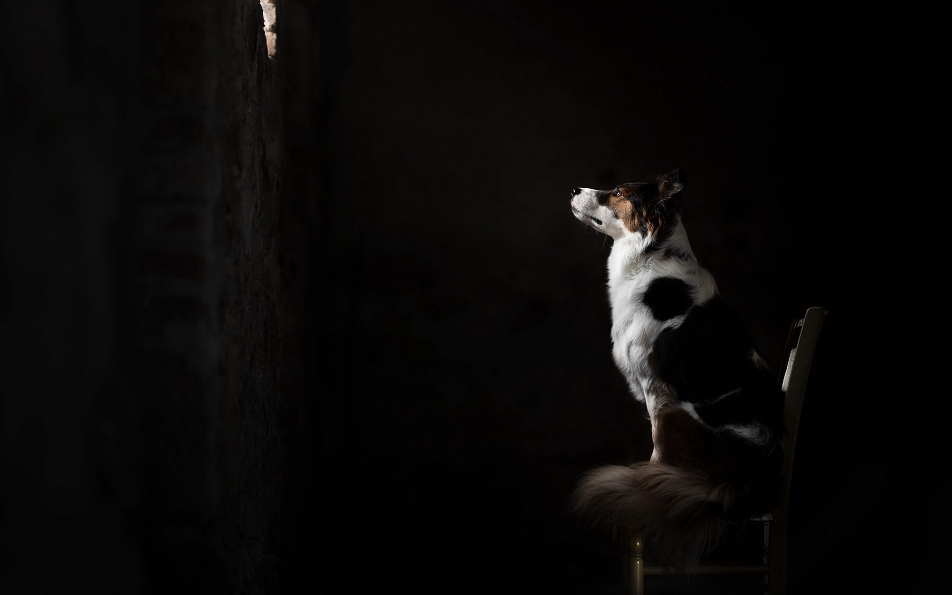 Description: A dog sitting on a chair looking out a window at the light coming in from the window behind it.