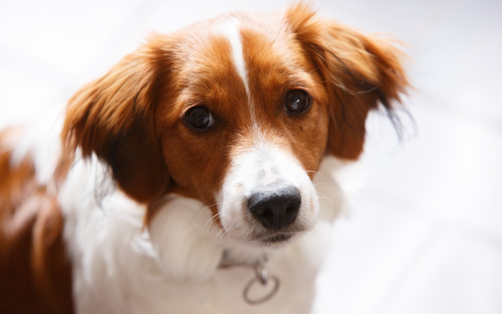 Description: A close up of a dog with a collar on it's neck and a white background with a brown and white dog.