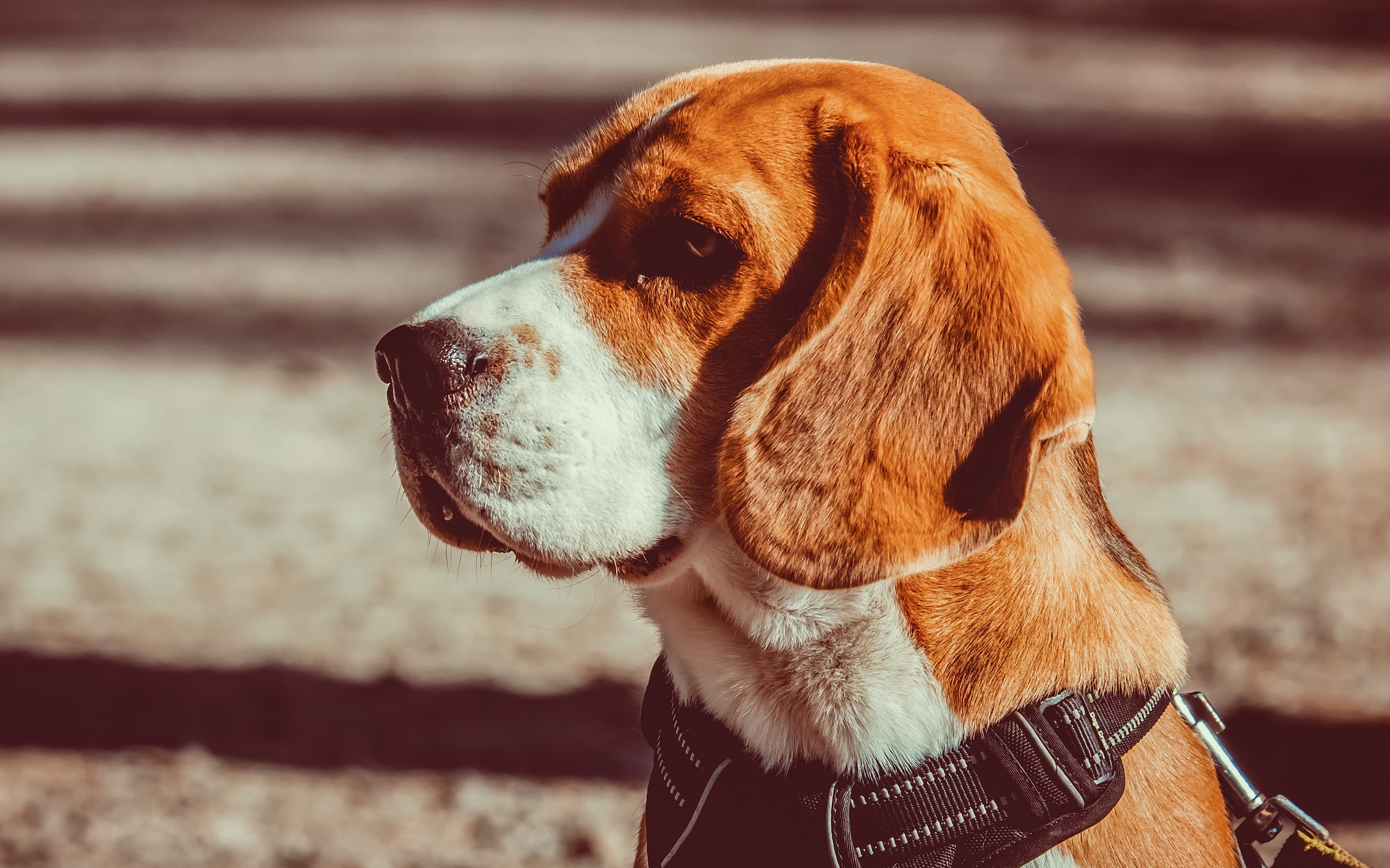 Description: A dog with a collar on looking off into the distance with a blurry background of grass and dirt.