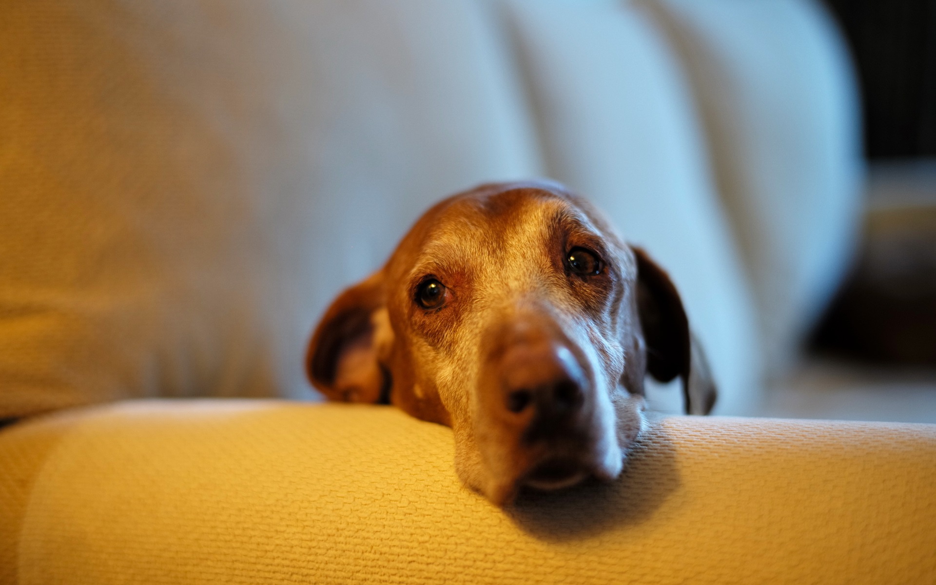 Description: A dog is sitting on a couch looking at the camera with a sad look on its face and eyes.