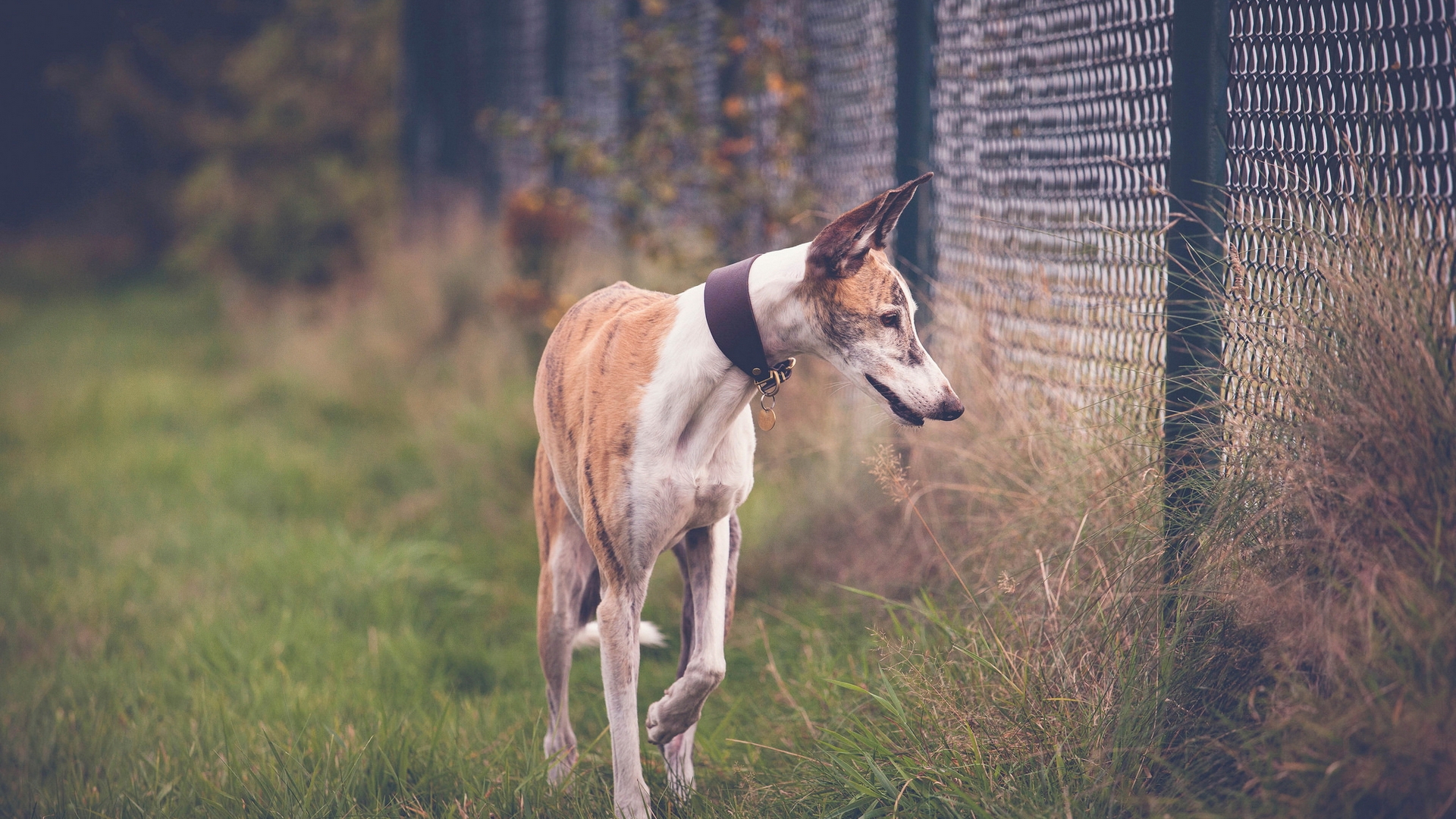 Description: A dog is walking by a fence in the grass and grass is green and brown and white and has a black collar.