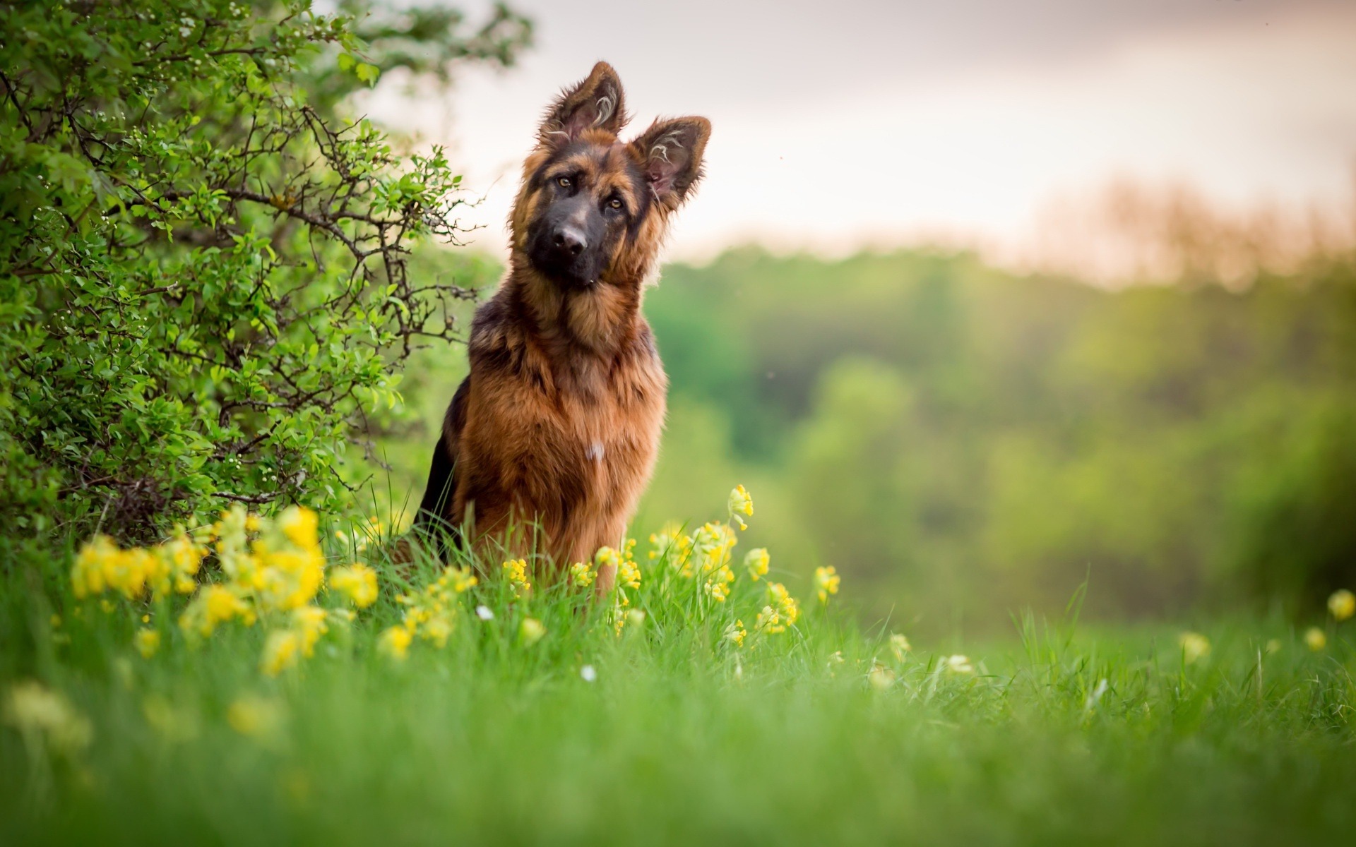 Description: A dog sitting in a field of grass and flowers with trees in the background and a sky in the background.
