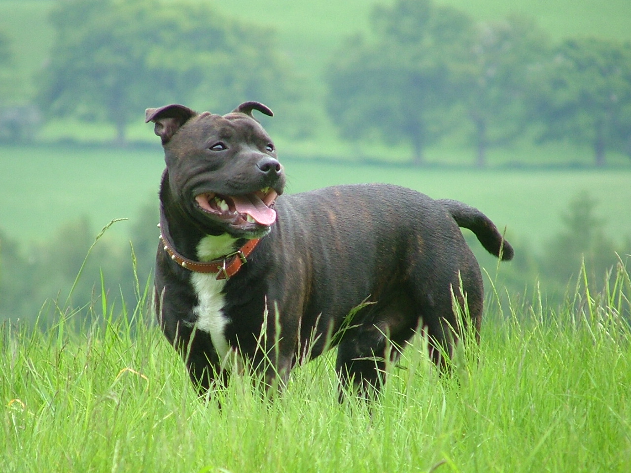 Description: A dog standing in a field of tall grass with trees in the background and a green field behind it.