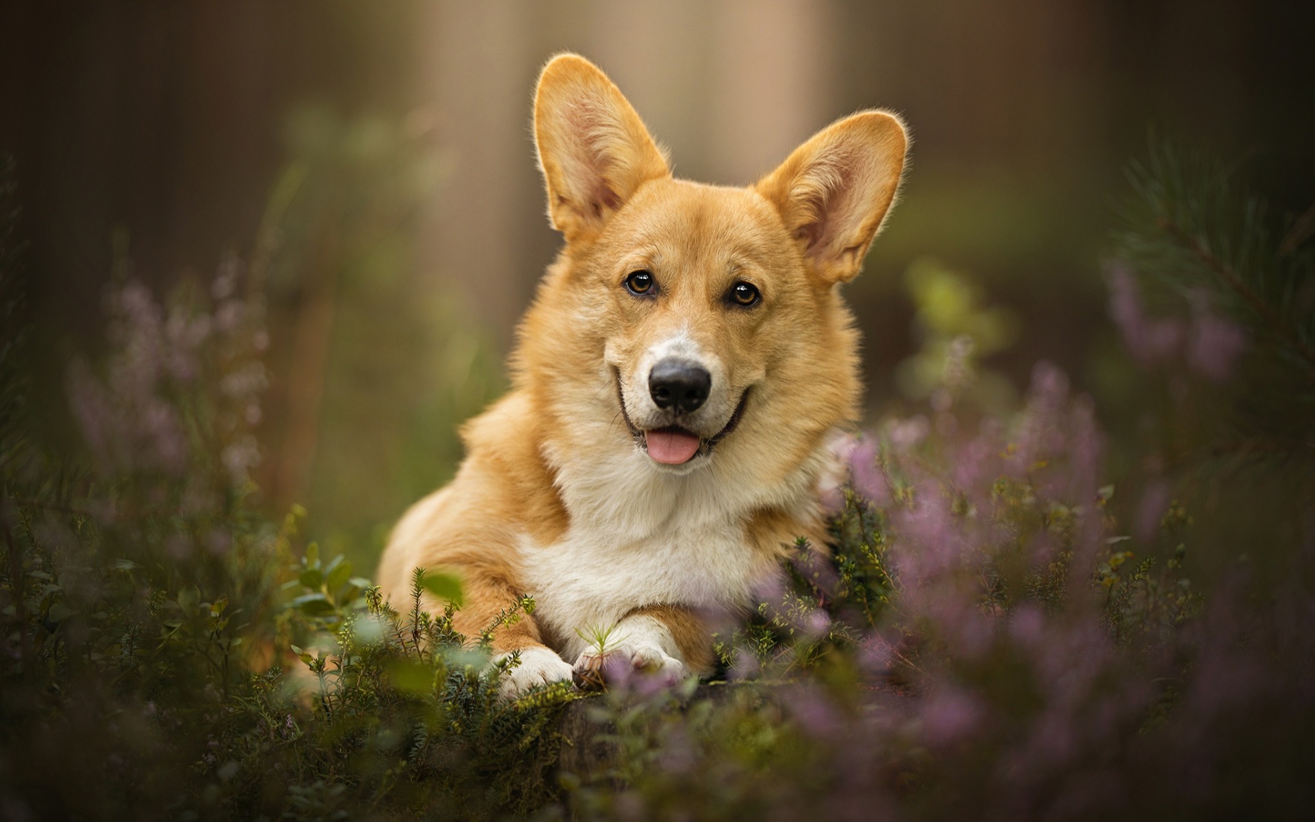 Description: A dog laying in a field of flowers with its tongue out and eyes open.