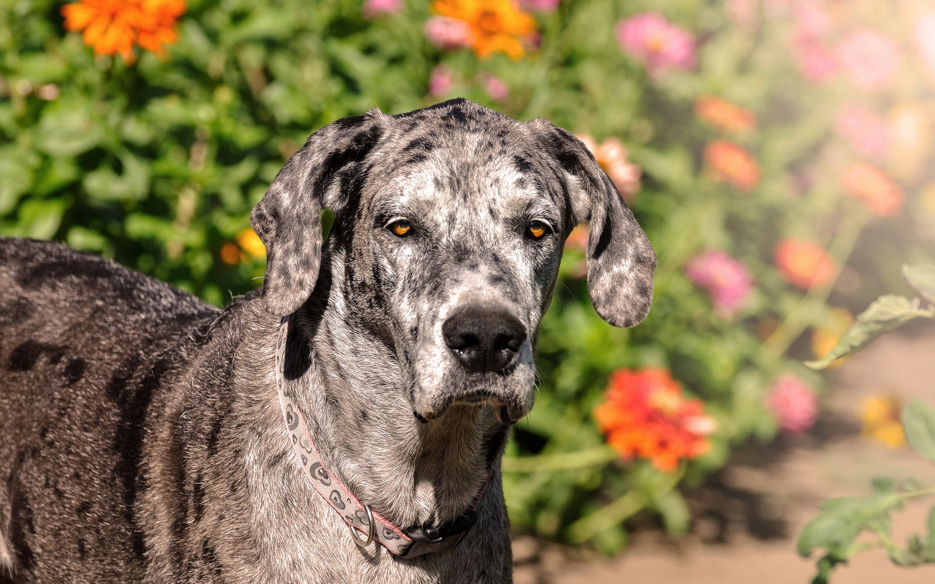 Description: A dog standing in front of a flower garden with a blurry background of flowers and a bush of flowers.