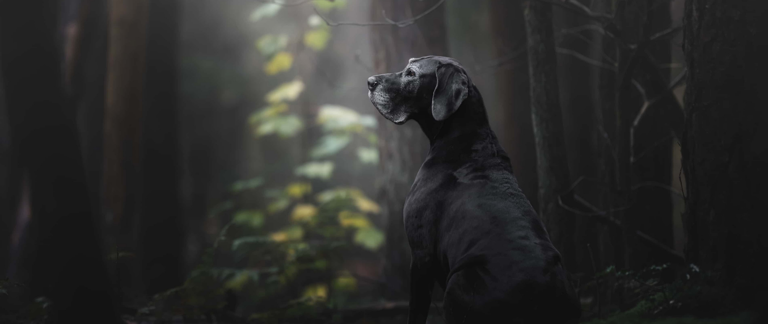 Description: A dog standing in the middle of a forest with trees in the background and fog in the air above.
