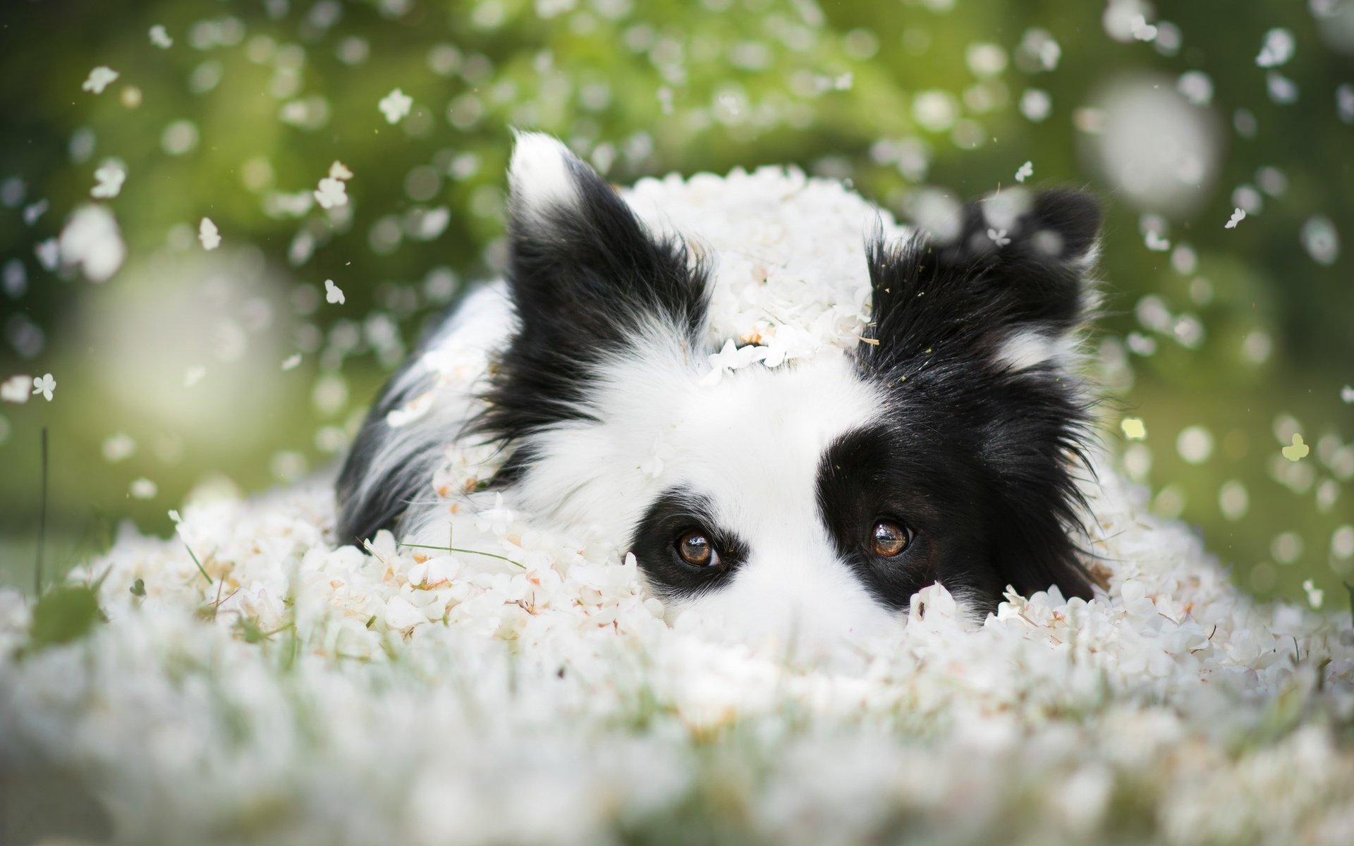 Description: A dog laying down in the grass with flowers around him and eyes wide open.
