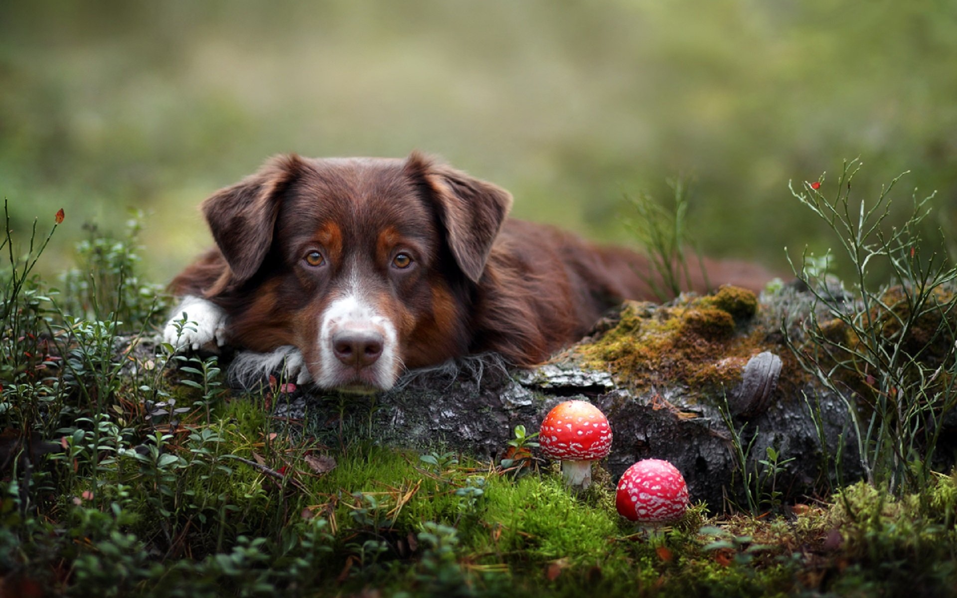 Description: A dog laying in the grass with a mushroom in the background and a mushroom in the foreground.