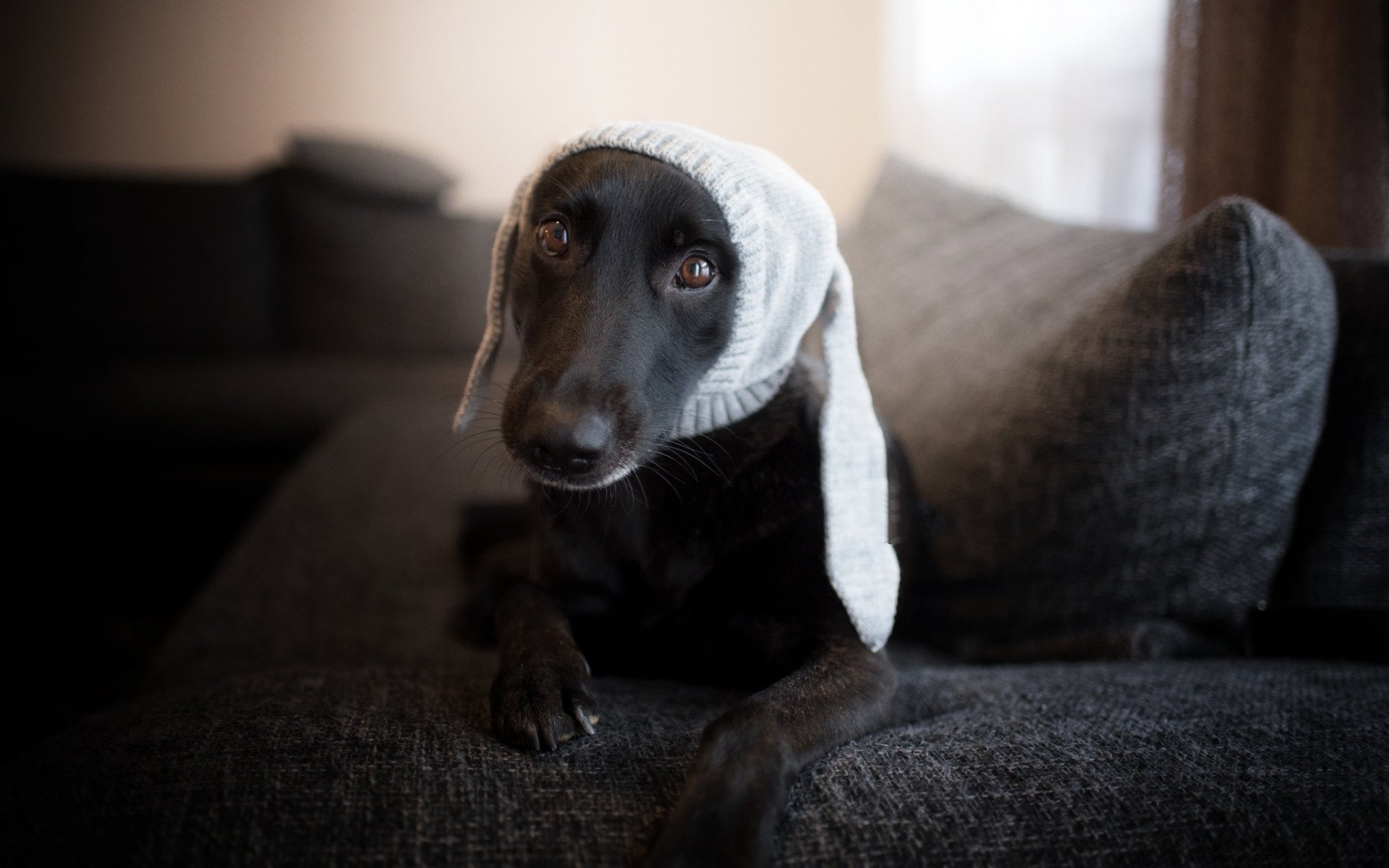Description: A dog wearing a hat sitting on a couch in a room with a window behind it and a couch.