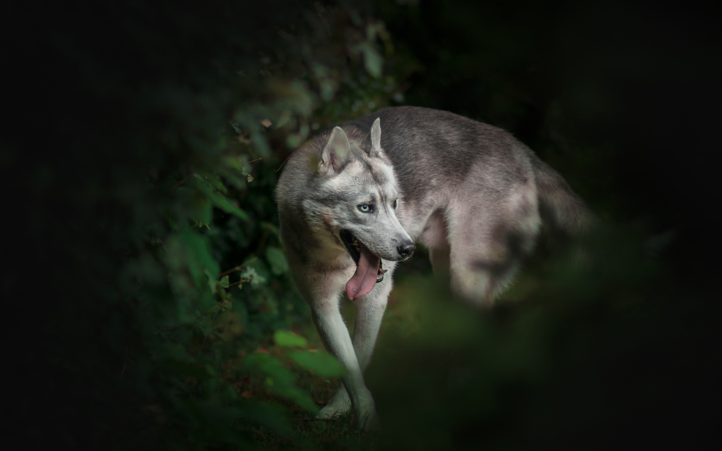 Description: A dog is standing in the dark with its tongue out and tongue out.