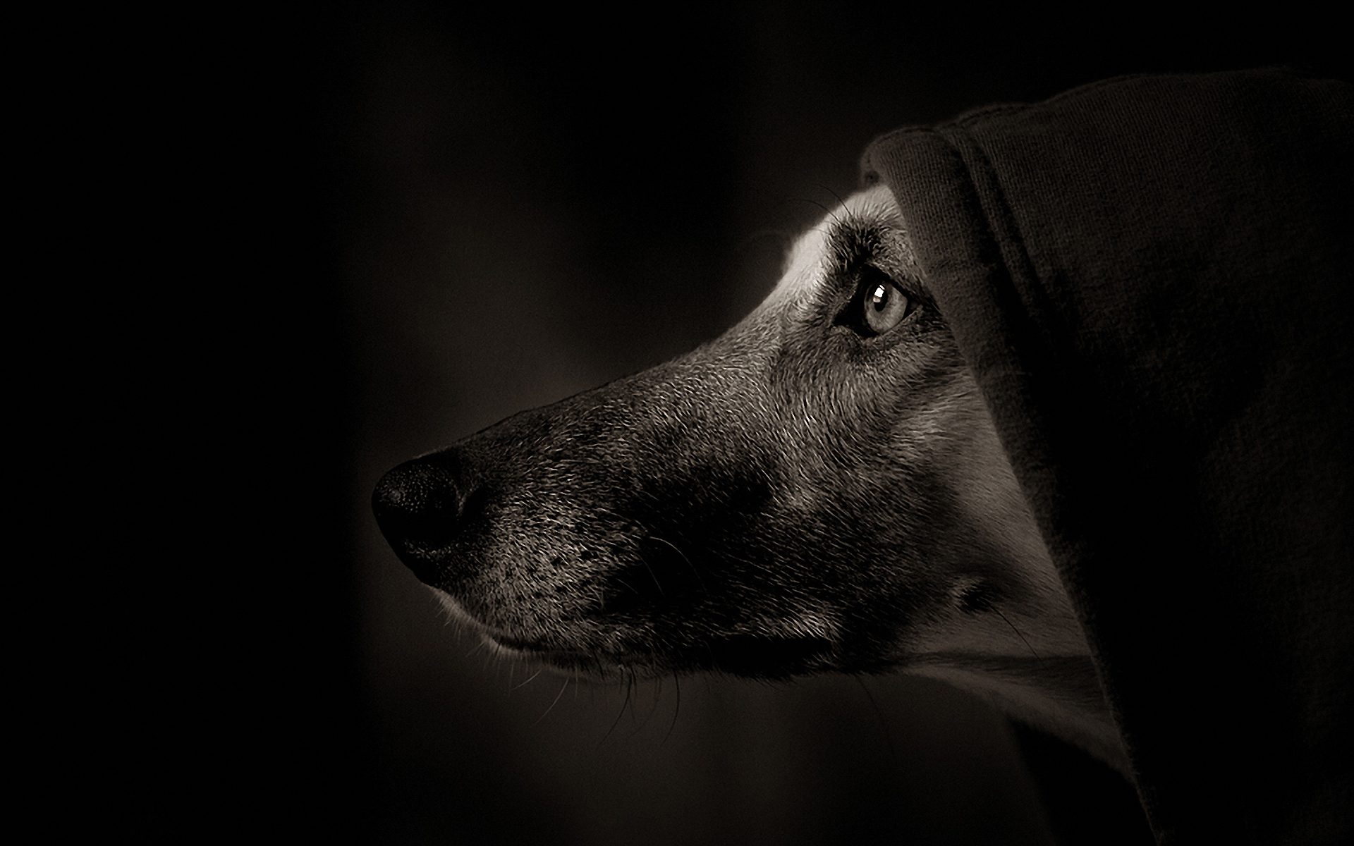 Description: A dog with a hood on looking off into the distance with a dark background and a black background with a dog's head.
