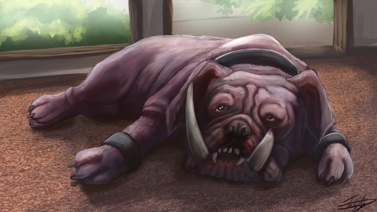 Description: A painting of a dog laying on the floor with a head on it's back and a collar around its neck.