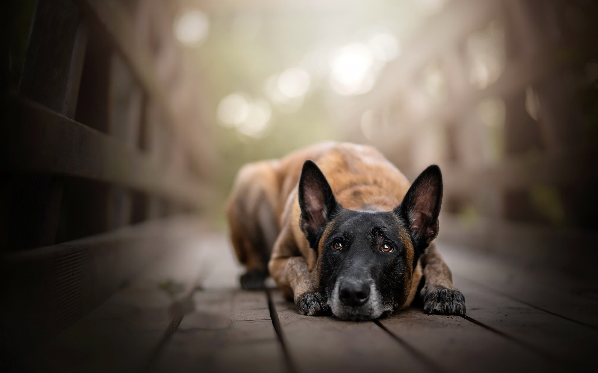 Description: A dog laying on a wooden floor in the middle of a walkway with his head on the ground and his eyes closed.