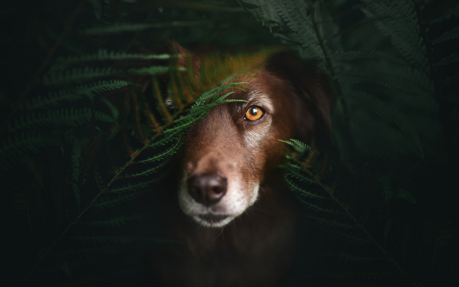 Description: A dog with a green leaf in its mouth looking through the leaves of a fern tree to the camera.