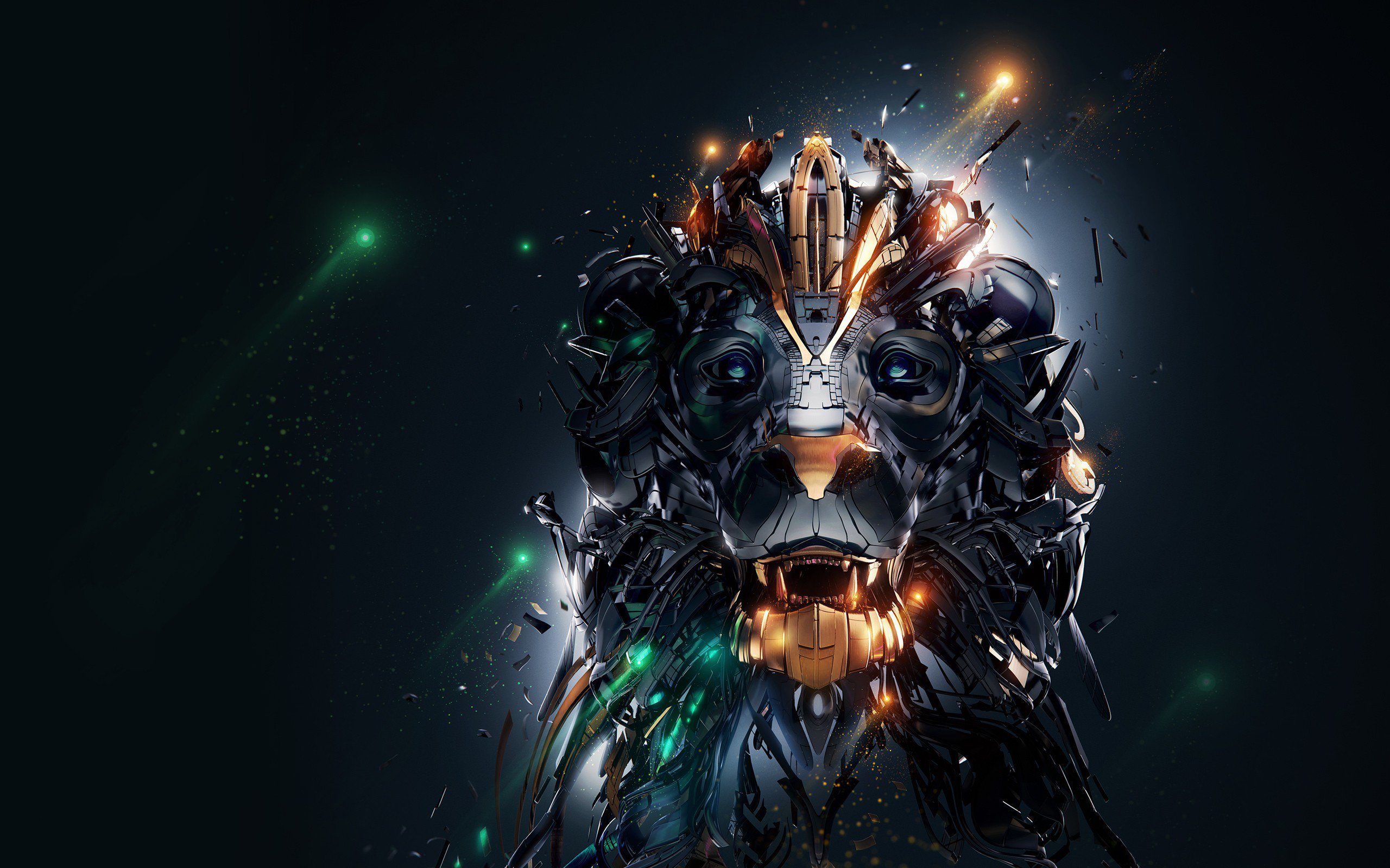 Description: A digital art work of a dog with a lot of lights on its face and a black background with a green and yellow light.