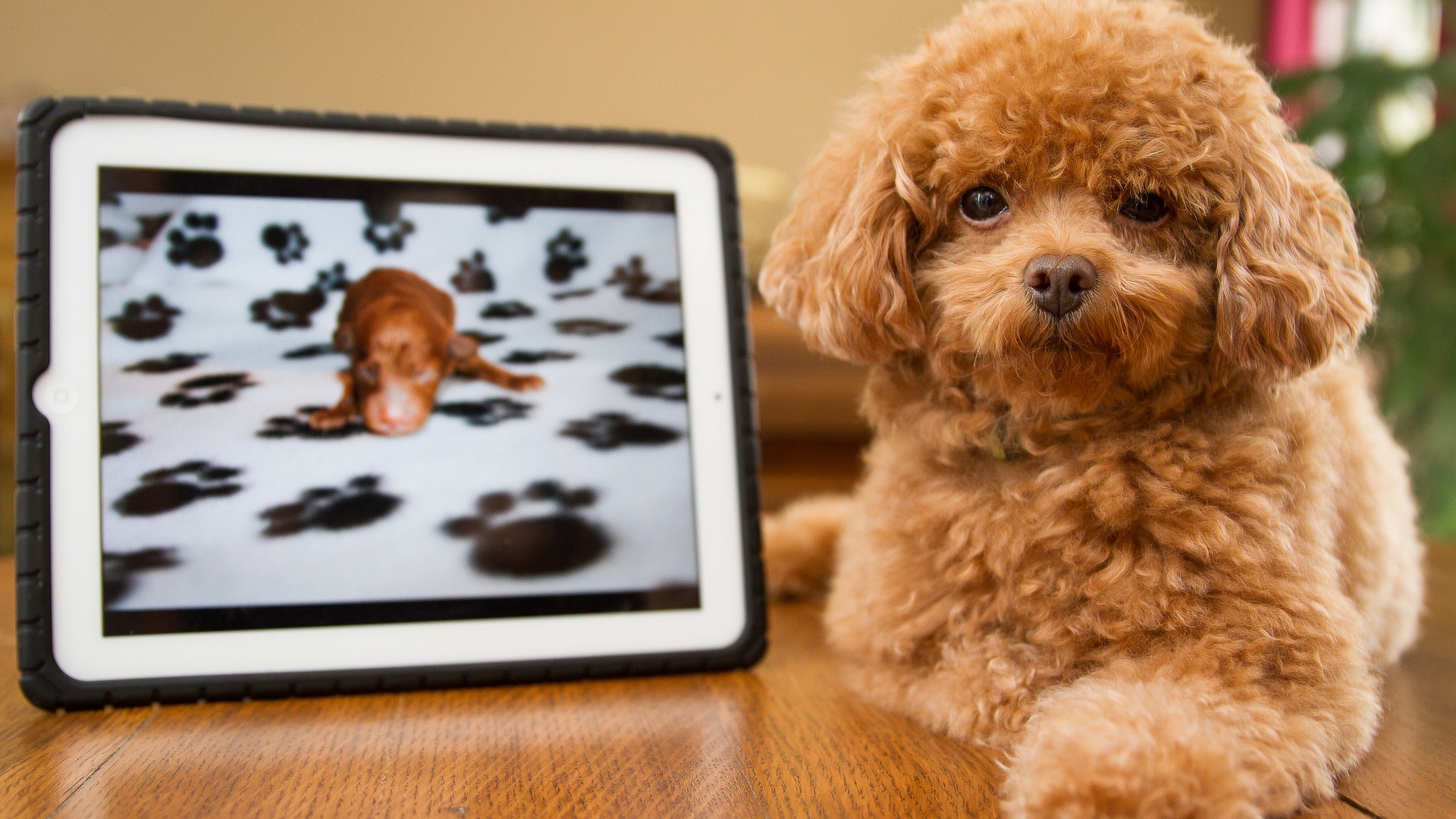 Description: A dog sitting next to a picture of a dog on a table with paw prints on it and a dog on the table.