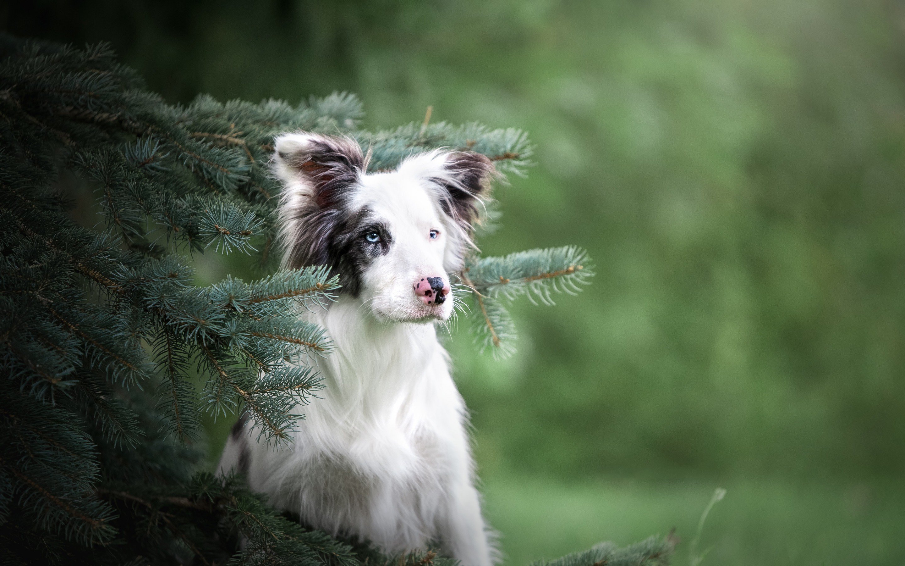 Description: A dog is peeking out from behind a tree branch with a blurry background of green foliage and a blurry background of a green - hued area.