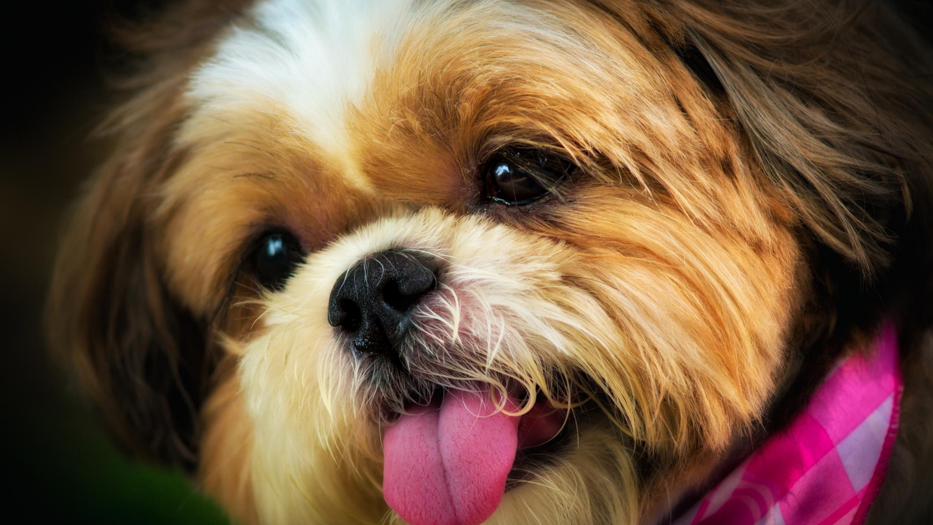 Description: A dog with a pink collar and tongue hanging out of its mouth with a black background and a pink and white checkered collar.